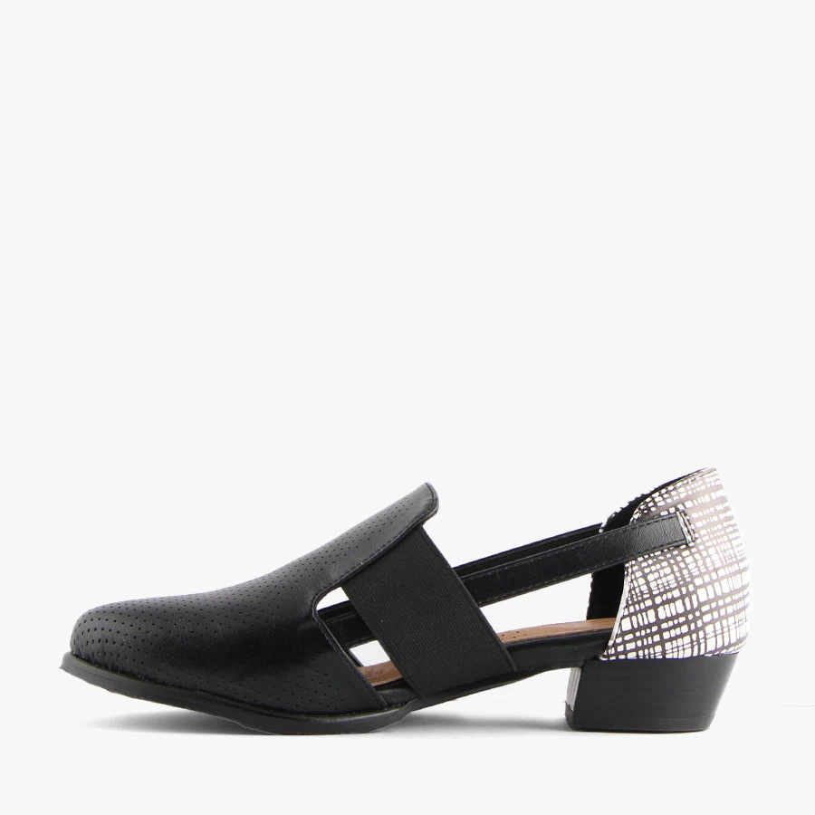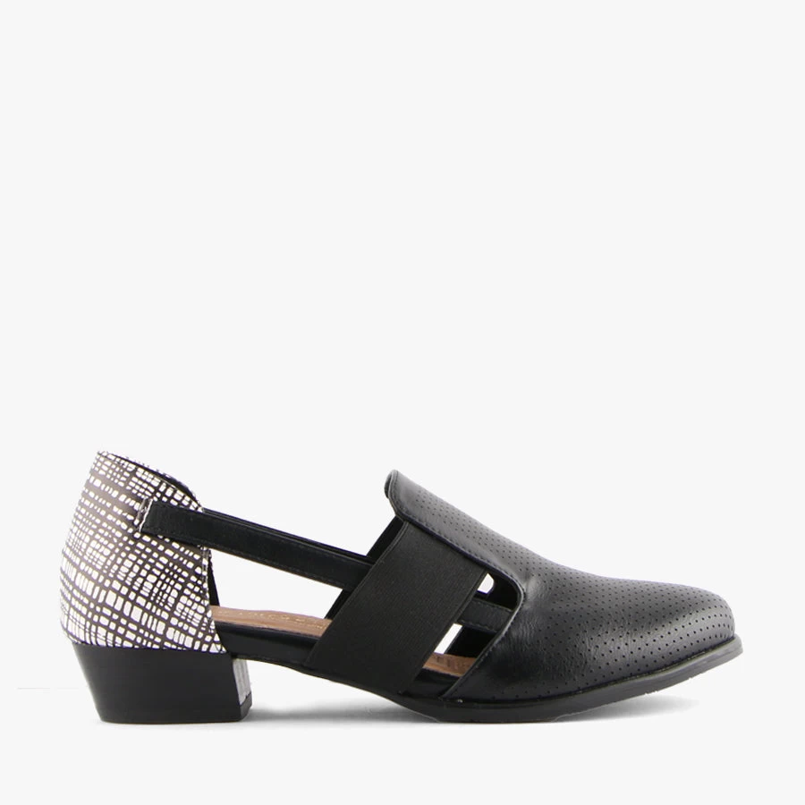 Amore by Step On Air is a woman’s dress shoe that features a small heel, crosshatch print back panel, and cut-out sides paired with an elastic strap.