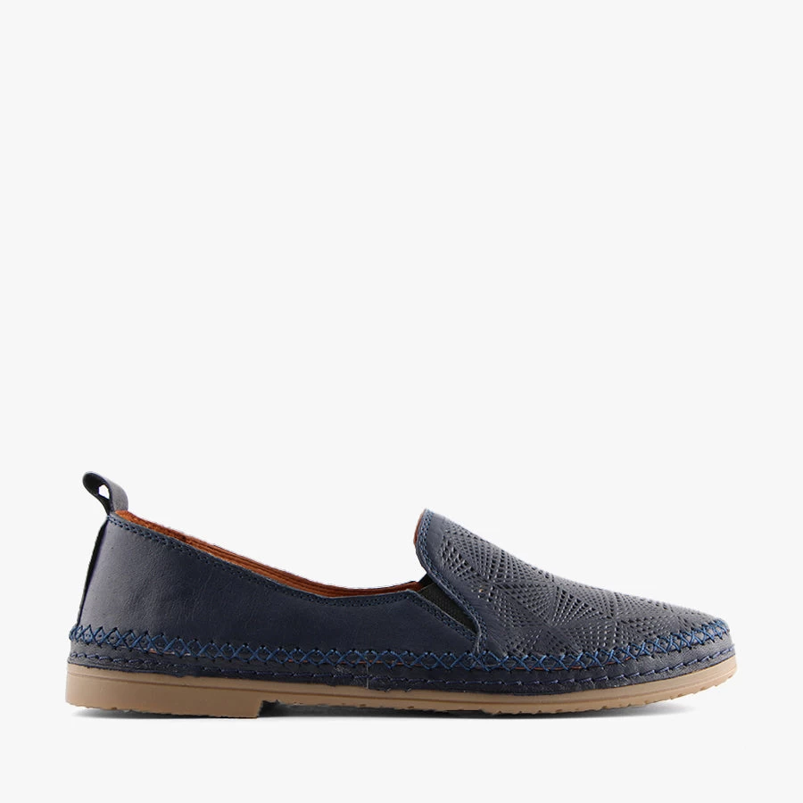 Benny by Donna Style is a women’s loafer that features a cushioned sole and a soft leather upper with a perforated geometric design.