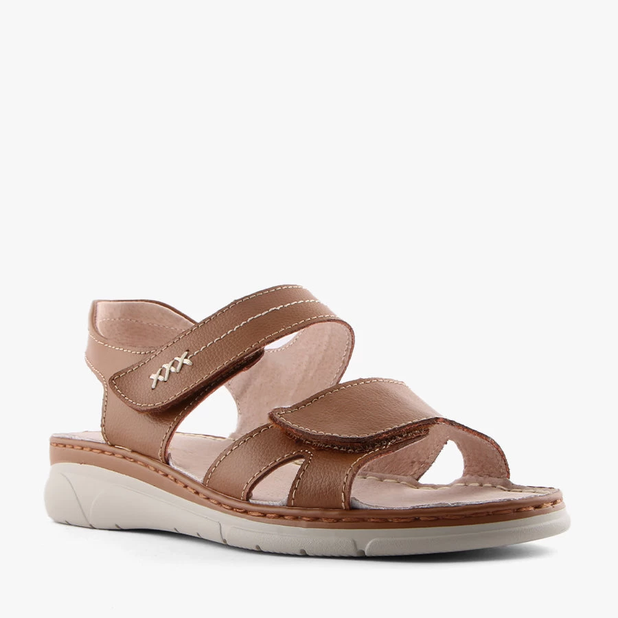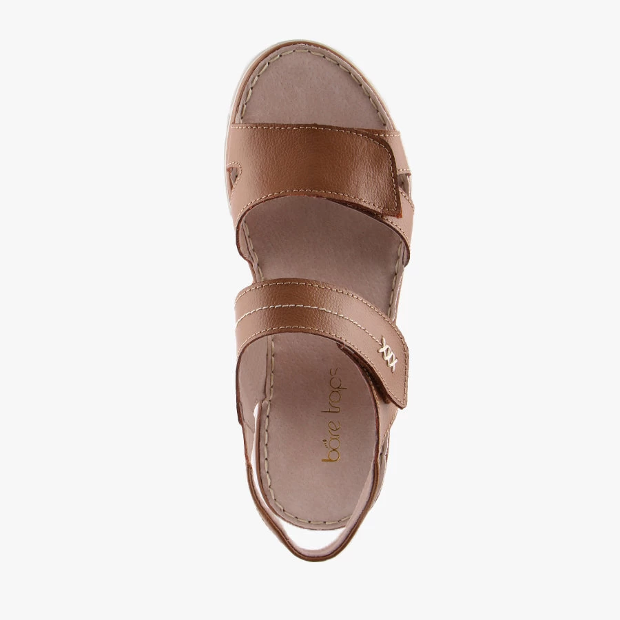 Cathy by Baretraps is a lightweight sandal that features a comfortable low wedge and dual adjustable velcro straps.