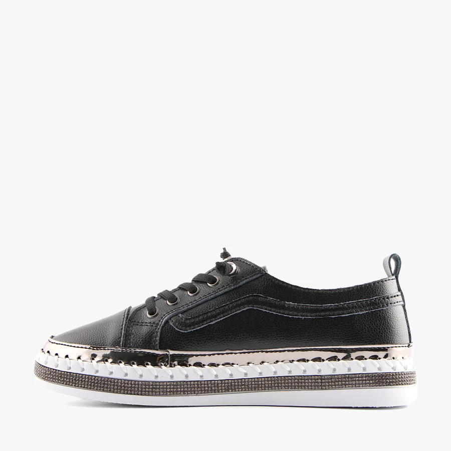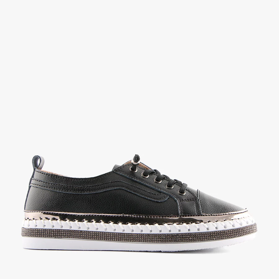 Cheery by Just Bee is a women’s slip on sneaker that features a stand out diamante trim around the sole, an extra soft leather upper and elastic bungee laces for easy wear.