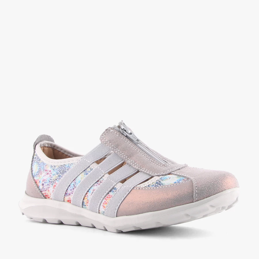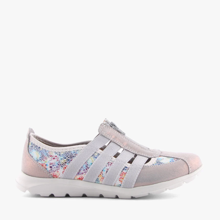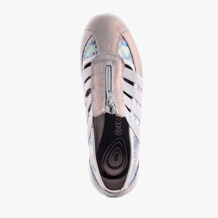 Slip into the sporty leisure style of Christine by CC Resorts. This women’s shoe features a bright speckled upper with metallic suede and elastic overlays finished with a zip closure and removable padded insole.