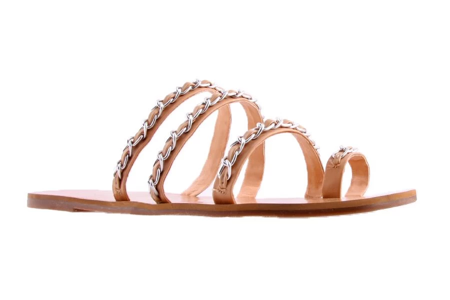 Cindy by Verali is a women’s sandal featuring slimline straps that wrap around the foot comfortably with a silver chain detail overlay.