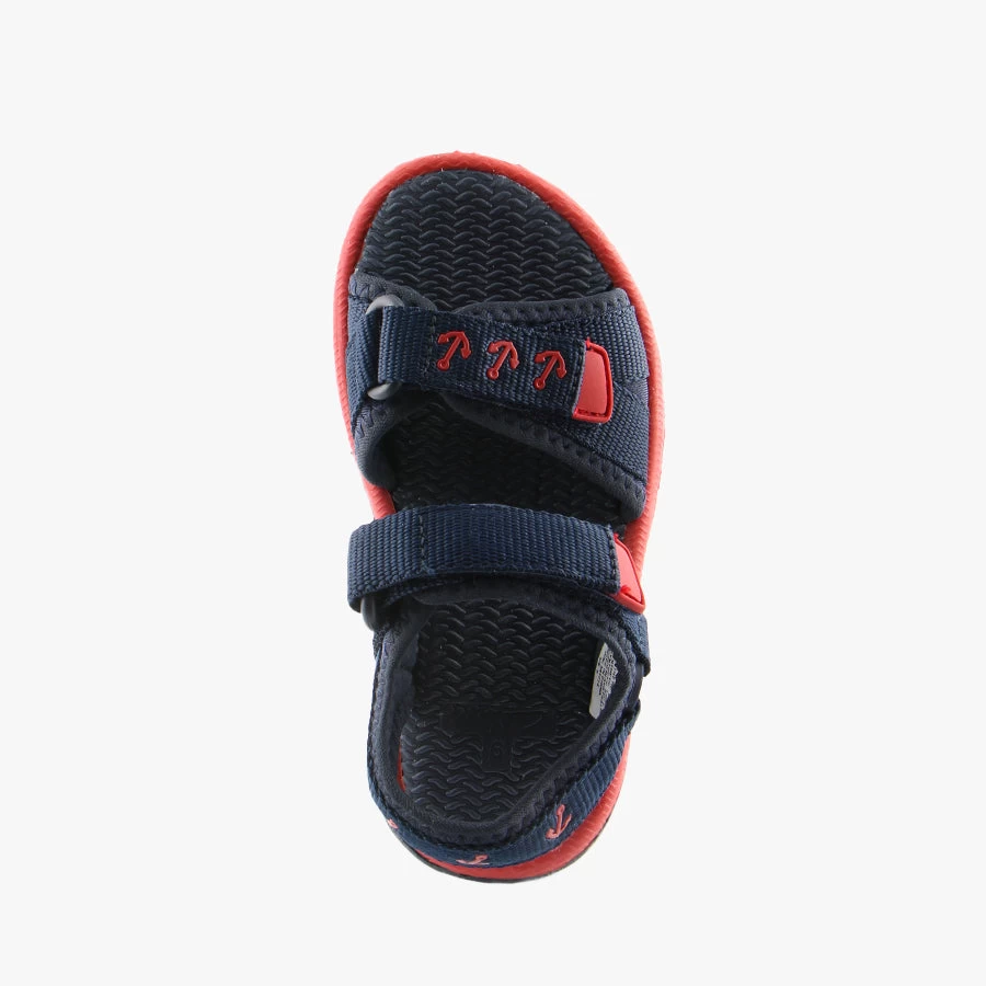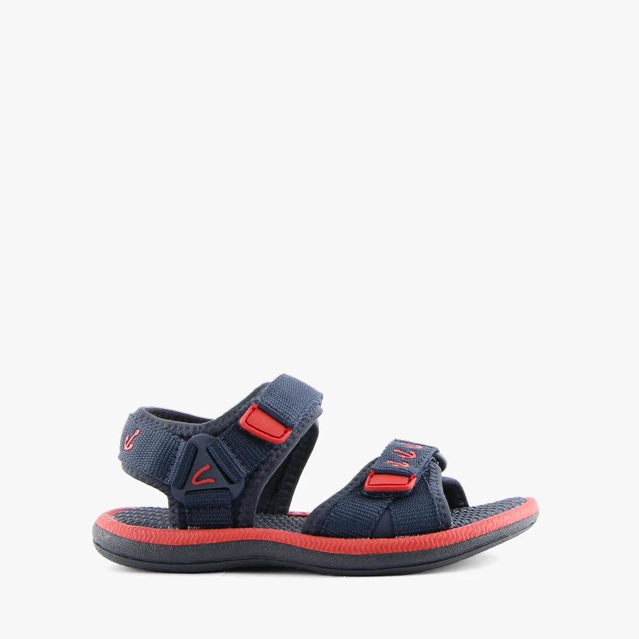 Finn by Clarks is a kid’s sandal featuring two adjustable velcro straps on the upper with a soft fabric lining and flexible sole.
