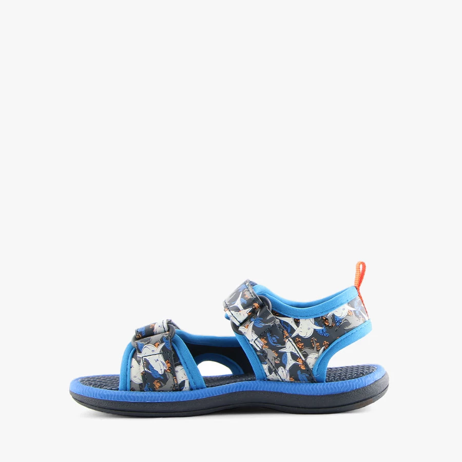 Fisher by Clarks is a kid’s sandal featuring two adjustable velcro straps on the upper with a soft fabric lining and flexible sole.
