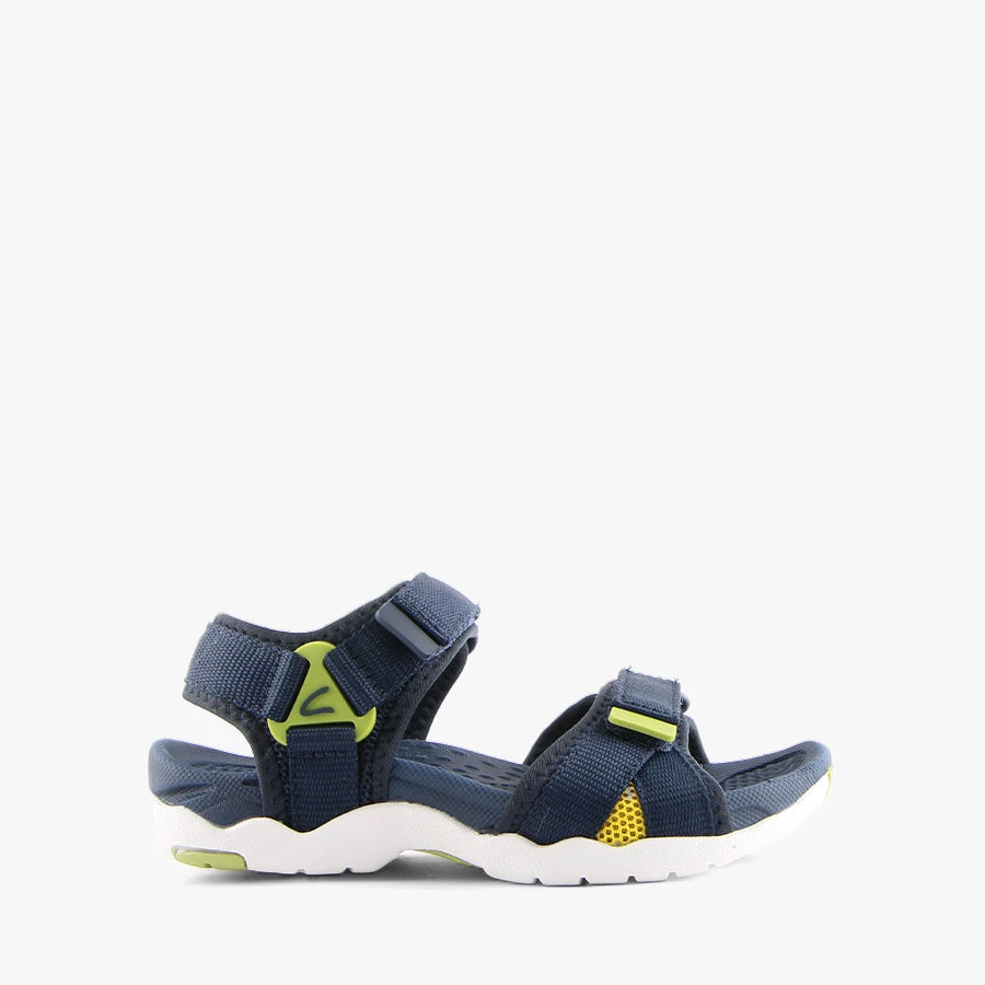 Theo by Clarks is a kid’s sandal featuring two adjustable velcro straps on the upper with a soft fabric lining and flexible sole.