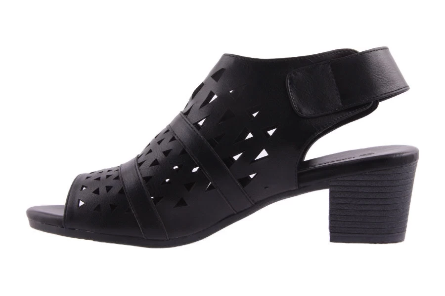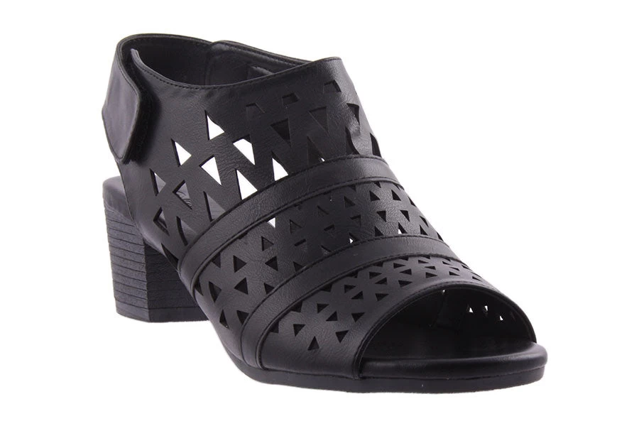 Davy by Isabella Brown is a womens block heel featuring a laser cut design and velcro fastening strap.