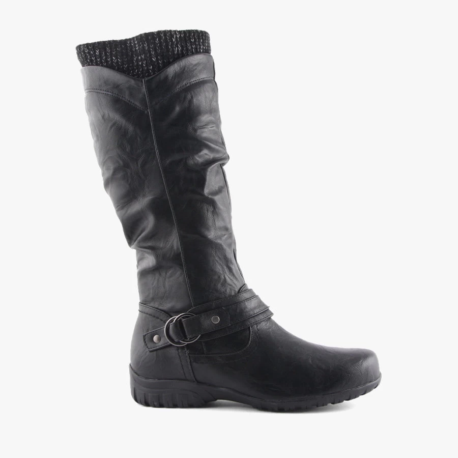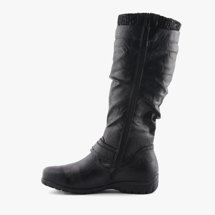 Be winter ready with Empress by Step on Air. This women’s knee high boot features knitted trim at the top opening finished with a full length side zipper and buckle trim.