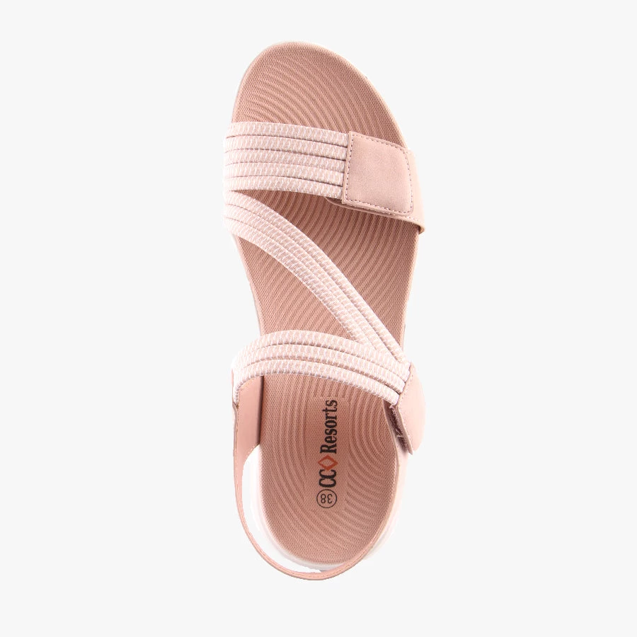 Florrie by CC Resorts is a flat sandal that features an ultra lightweight sole, stretchy elastic straps with two velcro fasteners.