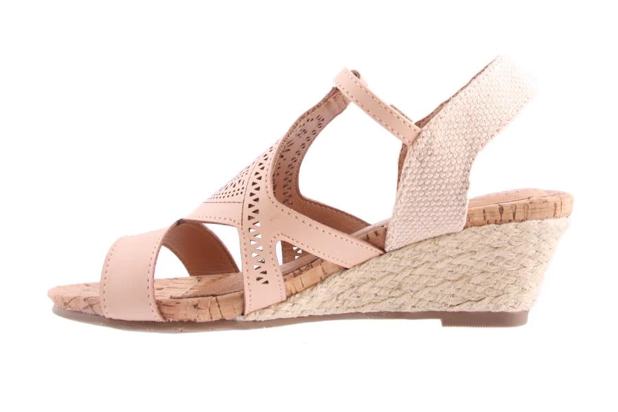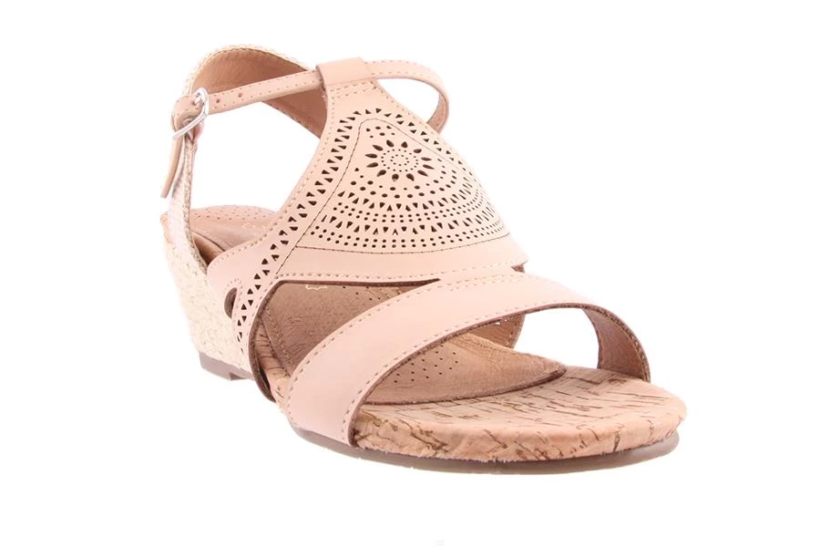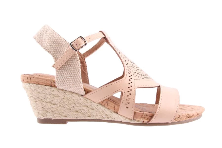 Furnace by Step on Air features a mid height stacked espadrilles wedge, laser cut upper and a buckled fastening strap.