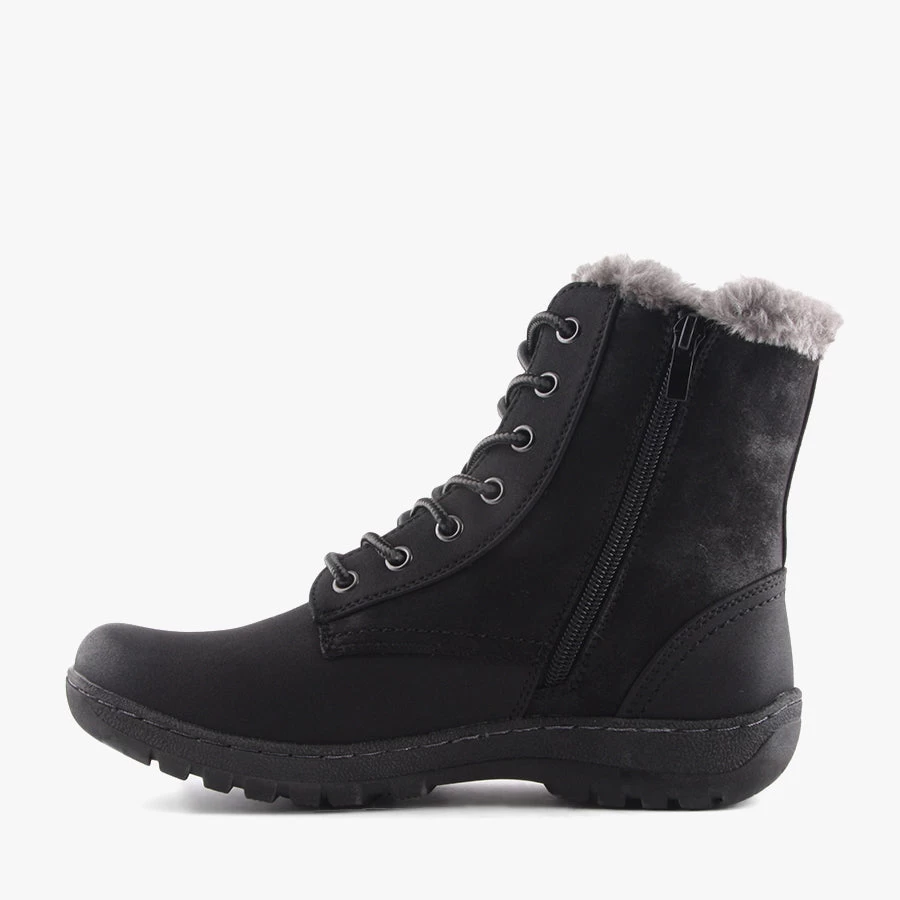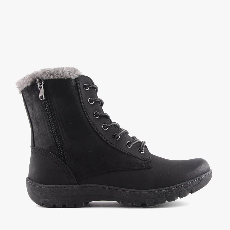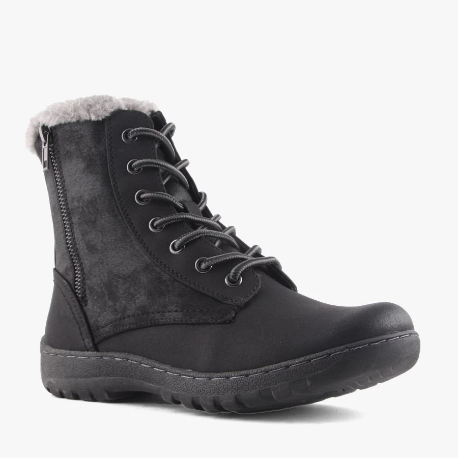 Gel by CC Resorts is a lace up woman’s ankle boot that features a soft faux fur lining, comfortable flat sole and decorative buckle detail.