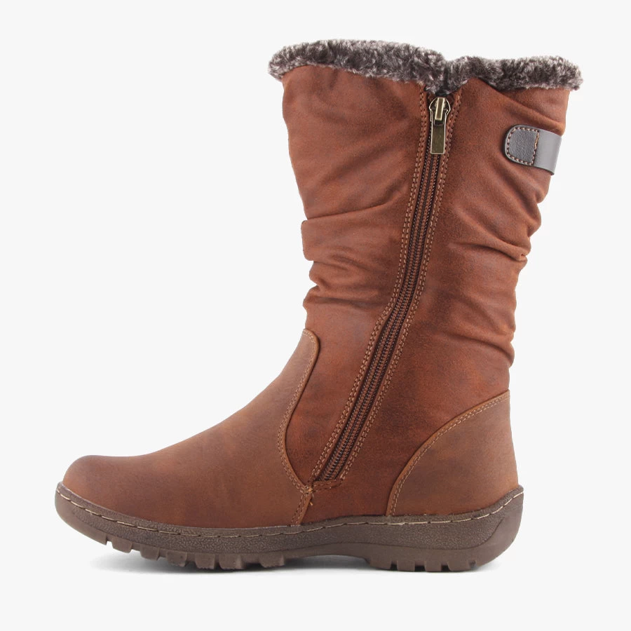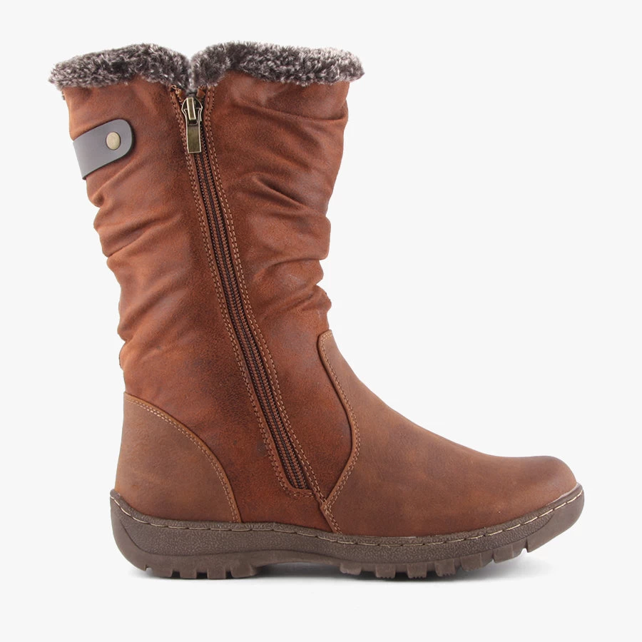 Goose by CC Resorts is a mid length woman’s boot that features a soft faux fur lining, comfortable flat sole and dual zips for easy wear.