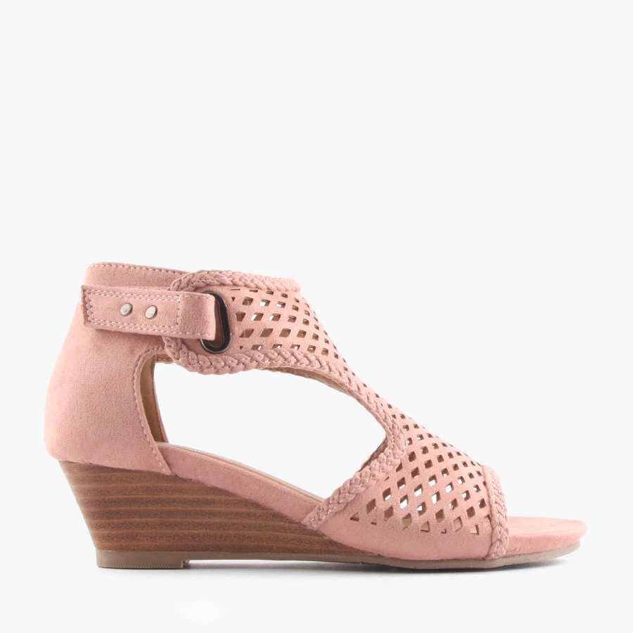 Great by Step On Air is a women’s wedge sandal featuring a laser cut upper, peep toe and velcro strap closure.