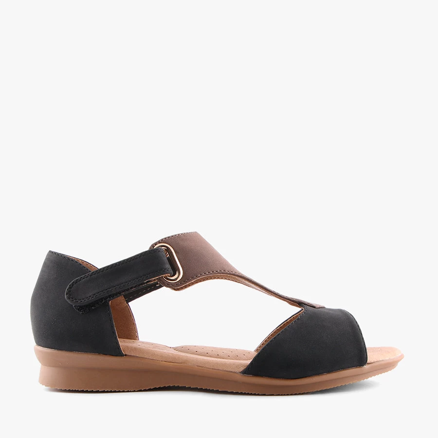 Juniper by Step On Air is a flat sandal that features a closed in back, lightweight sole and dual velcro straps for easy access.