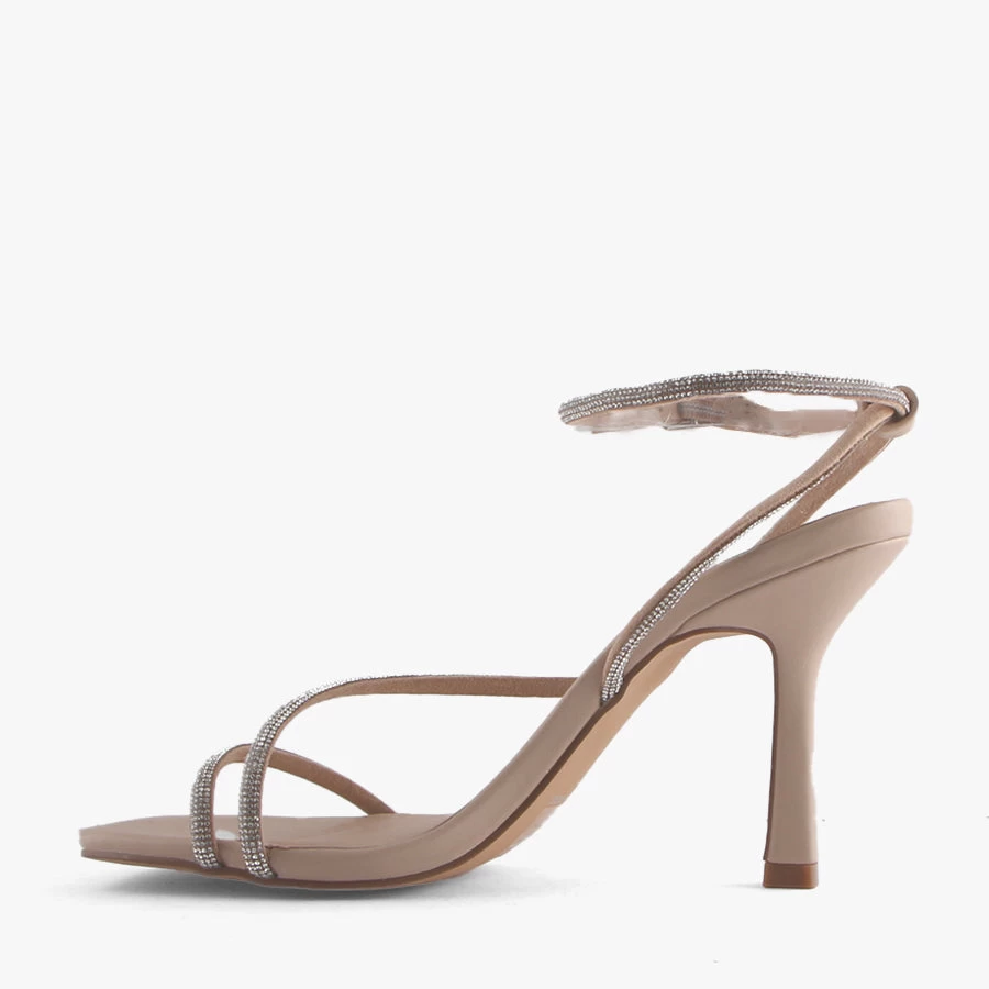 Sparkle in Kacey by London Rebel. This elegant strappy heel is embellished with diamante crossover toe-strap and statement diamante adjustable ankle strap.