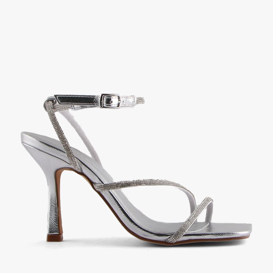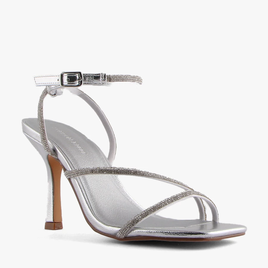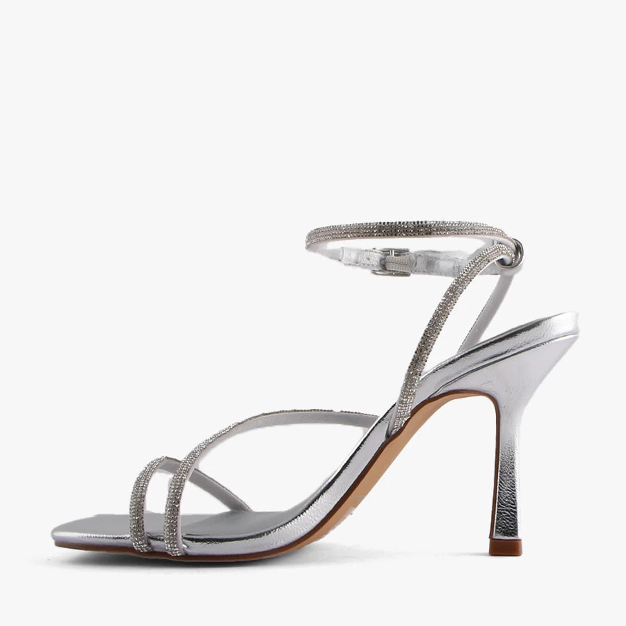 Sparkle in Kacey by London Rebel. This elegant strappy heel is embellished with diamante crossover toe-strap and statement diamante adjustable ankle strap.