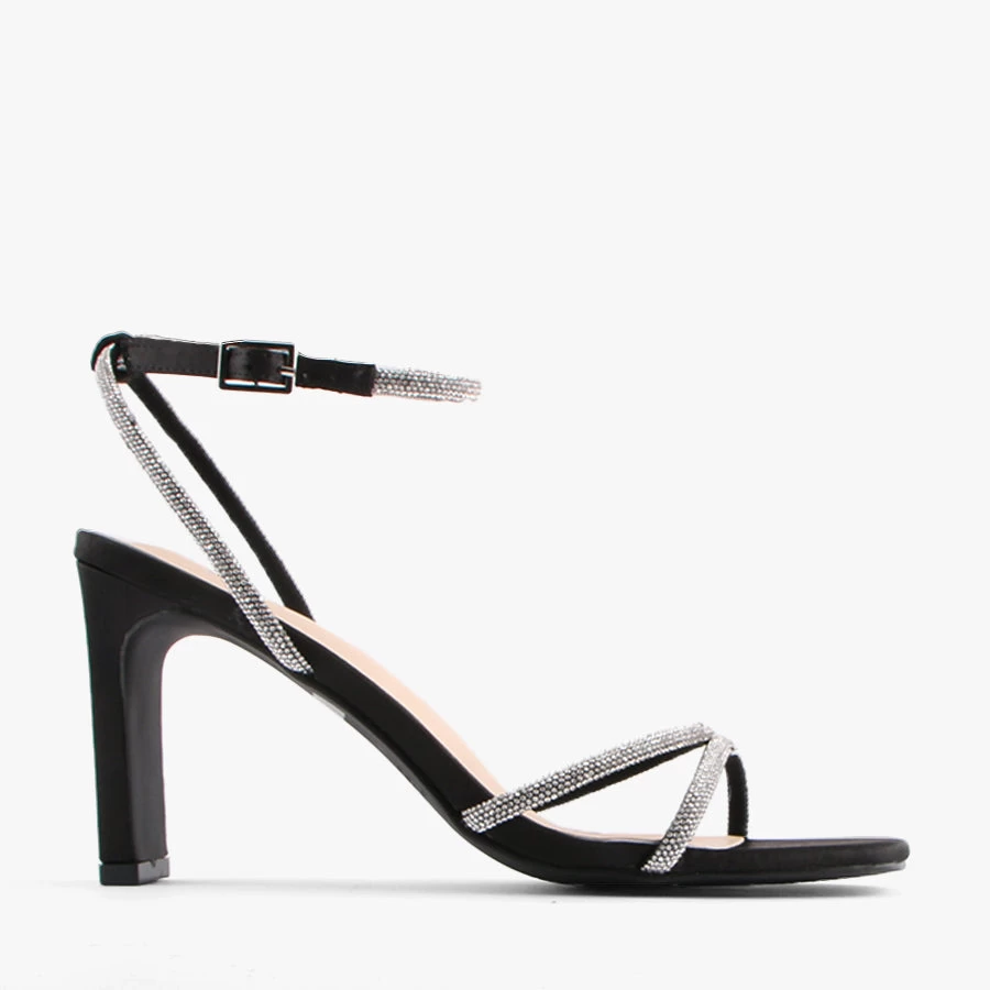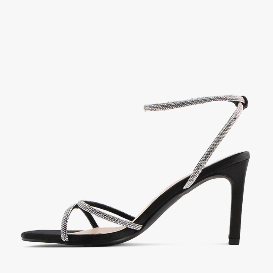 Sparkle in Kian by Verali. This elegant sandal features an on trend slim block heel, perfect for dancing the night away. Kian is embellished with diamante crossover toe-strap and statement diamante adjustable ankle strap.
