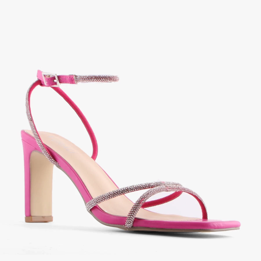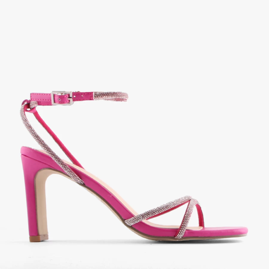 Sparkle in Kian by Verali. This elegant sandal features an on trend slim block heel, perfect for dancing the night away. Kian is embellished with diamante crossover toe-strap and statement diamante adjustable ankle strap.