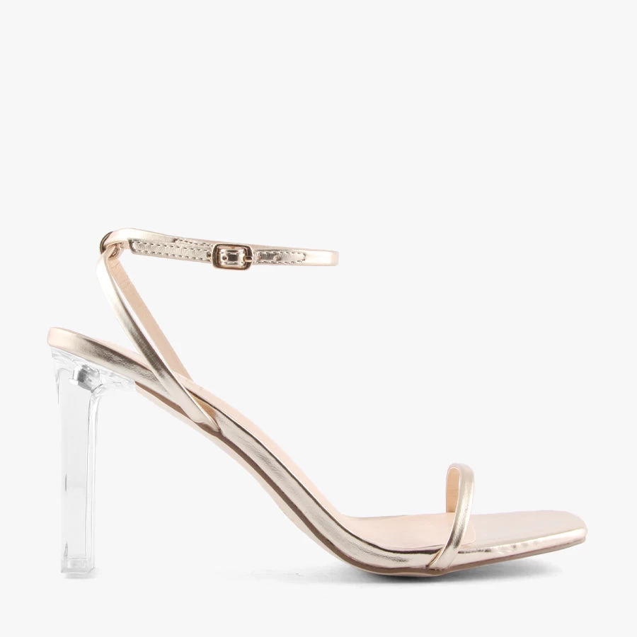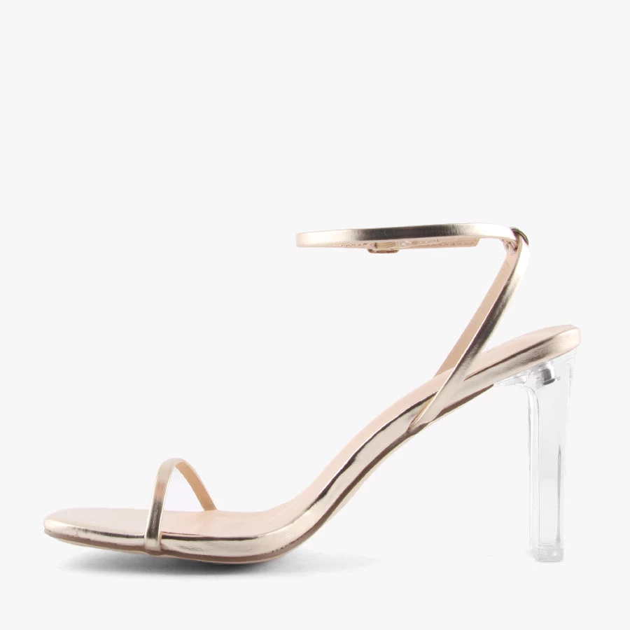 Get dressy with Kirabo by Verali. This elegant sandal features an on trend slim block heel, metallic upper and statement clear heel.