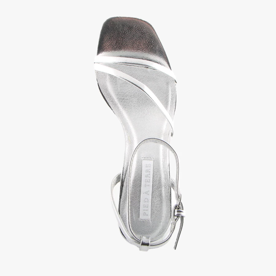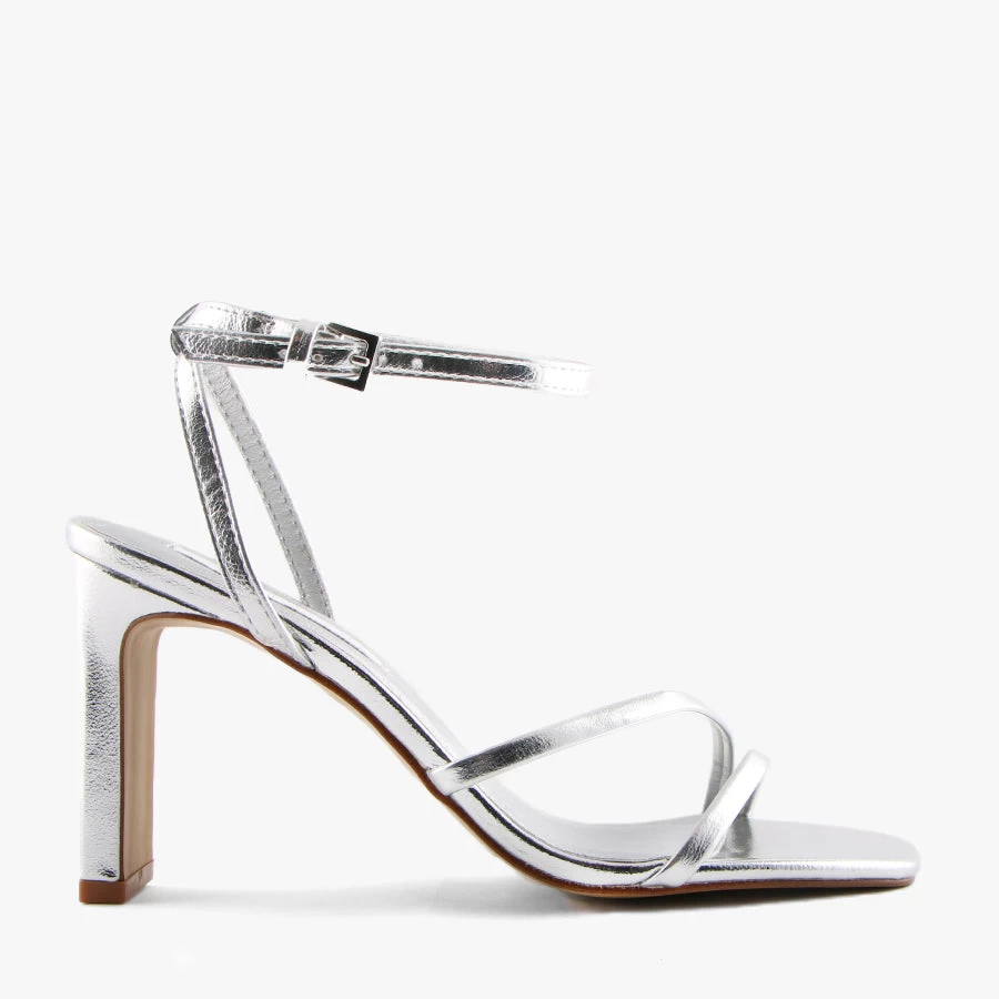 Mae by Pied A Terre is a strappy sandal that features an on trend rectangle block heel, fun metallic upper and adjustable buckled ankle strap.