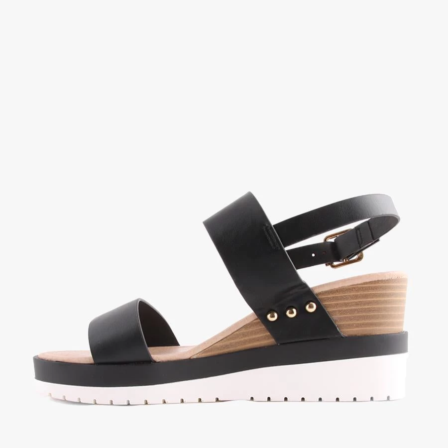 Malibu by Pied A Terre is a platform wedge featuring a multicoloured layered wedge, slingback ankle strap, and gold detailing. This wedge is perfect to pair with both casual and dressy outfits, and can be used day to night.