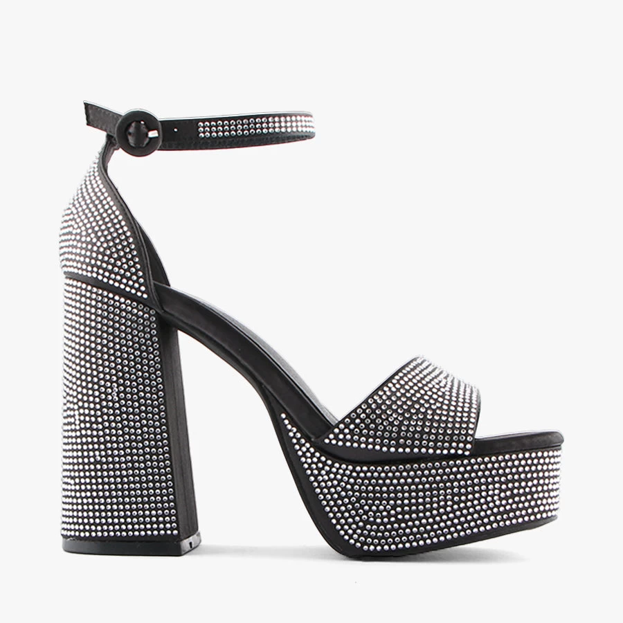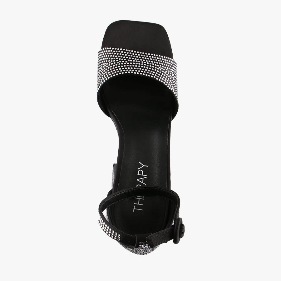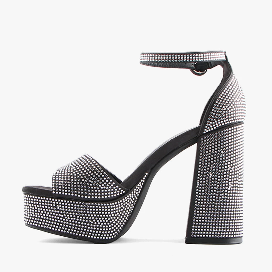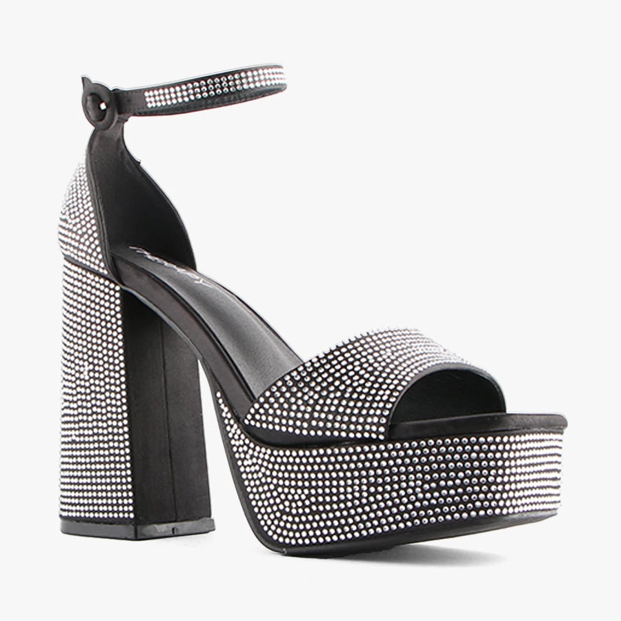 Get the perfect party look in Moda By Therapy. This beautiful platform heel features a satin upper upper with rhinestone detailing, square open toe, flared block heel and adjustable ankle strap. Perfect with jeans or a dress.