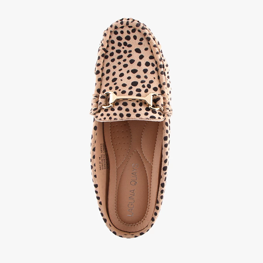 Nat by Laguna Quays is a backless women’s loafer that features a padded insole, soft micro suede upper with gold detail.