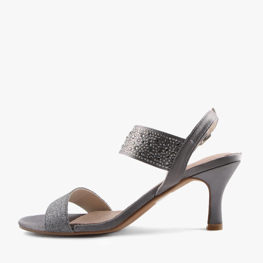 Nuke by Clarice is a dress sandal that will add a little glamour to any outfit. Nuke features a buckled ankle strap and a smart satin upper with diamante embellishments.