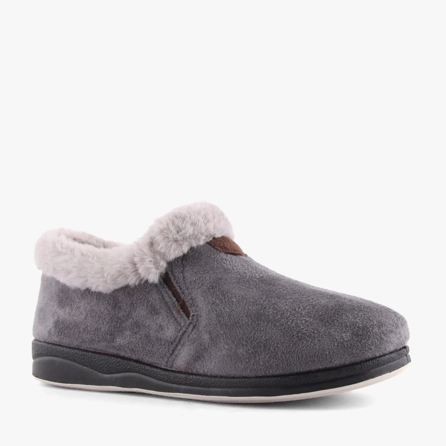 Elivia by Panda is a women’s slipper providing comfort and warmth. Featuring a microsuede upper with faux fur trim and a flexible sole.
