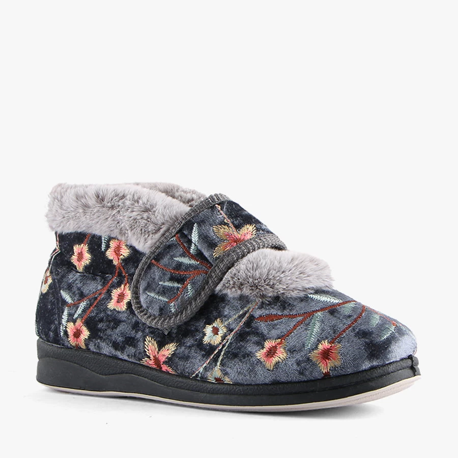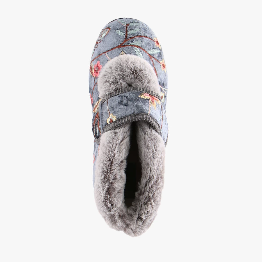 Emee by Panda is a women’s slipper with a velour upper, a velcro velour strap with an inner synthetic fleece lining, cushioned insole and a small heel. All Panda slipper feature a non-marking rubber outsole.