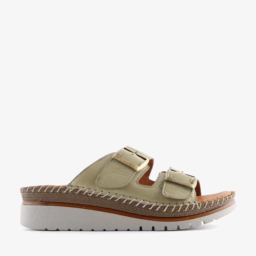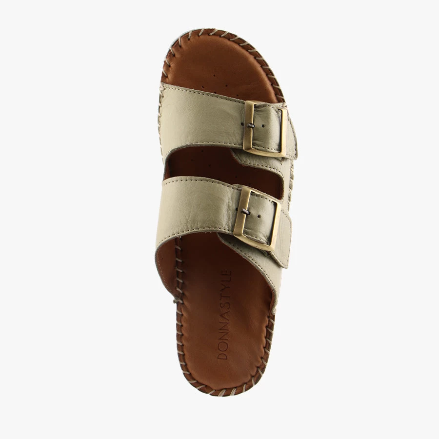 Perry by Donna style is a women’s slip on sandal that features a smooth and soft leather upper and padded sole for added comfort.