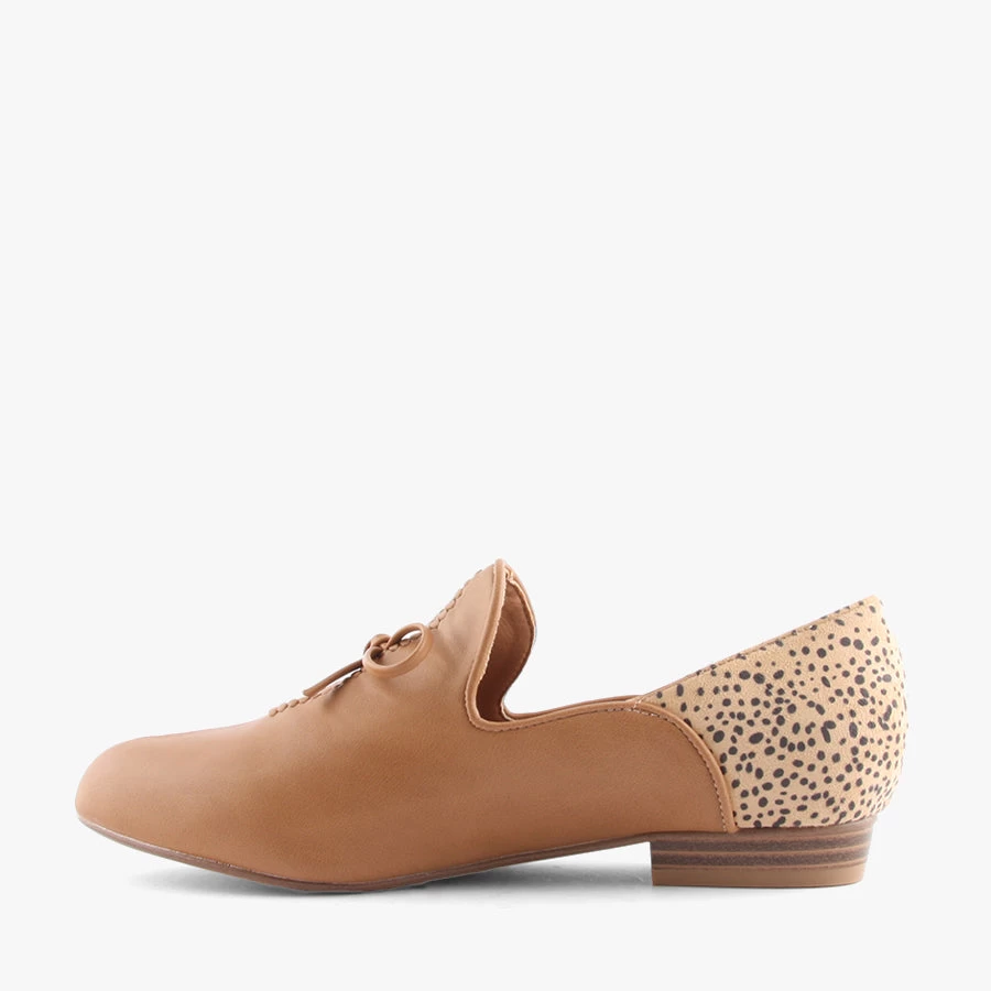 Planner by Step On Air is a woman’s dress shoe that features a small heel, cheetah print back panel, and slit design on the front with decorative bow.