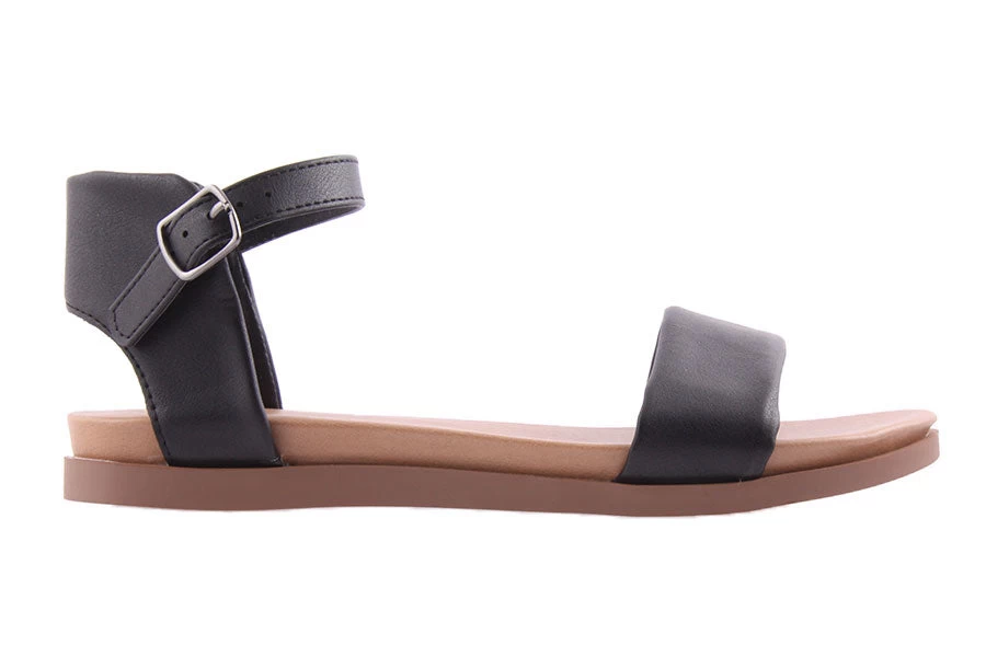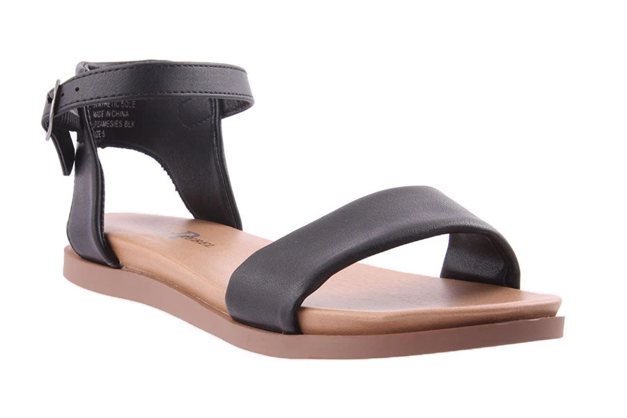 This flat sandal by London Rebel is staple for every wardrobe. Samesies features a high back, gold buckled ankle strap and padded sole.