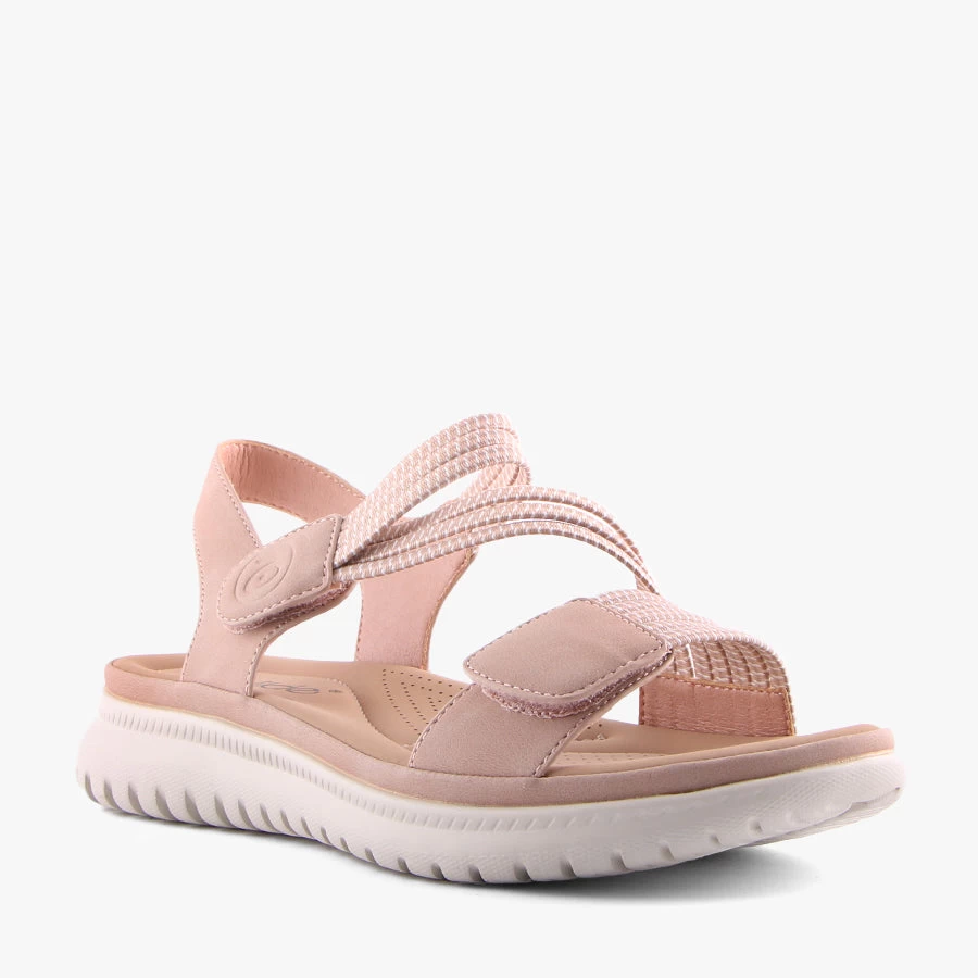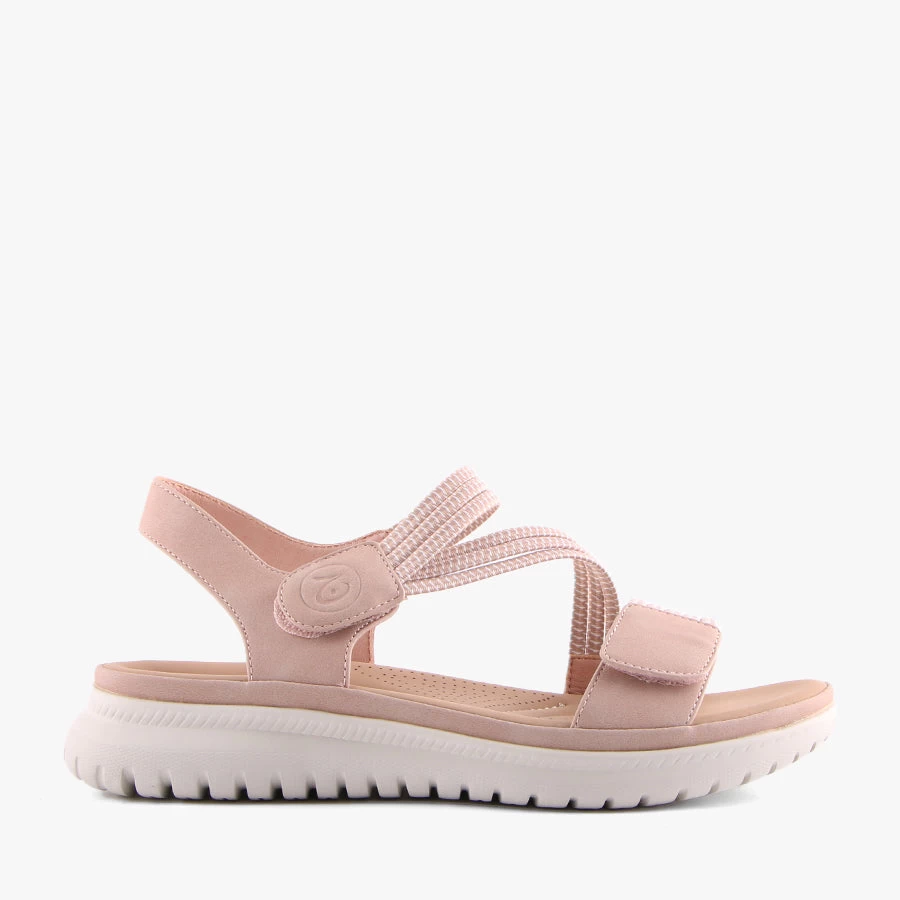 Sannah by Wilde is a flat sandal that features an ultra lightweight sole, stretchy elastic straps with two velcro fasteners.