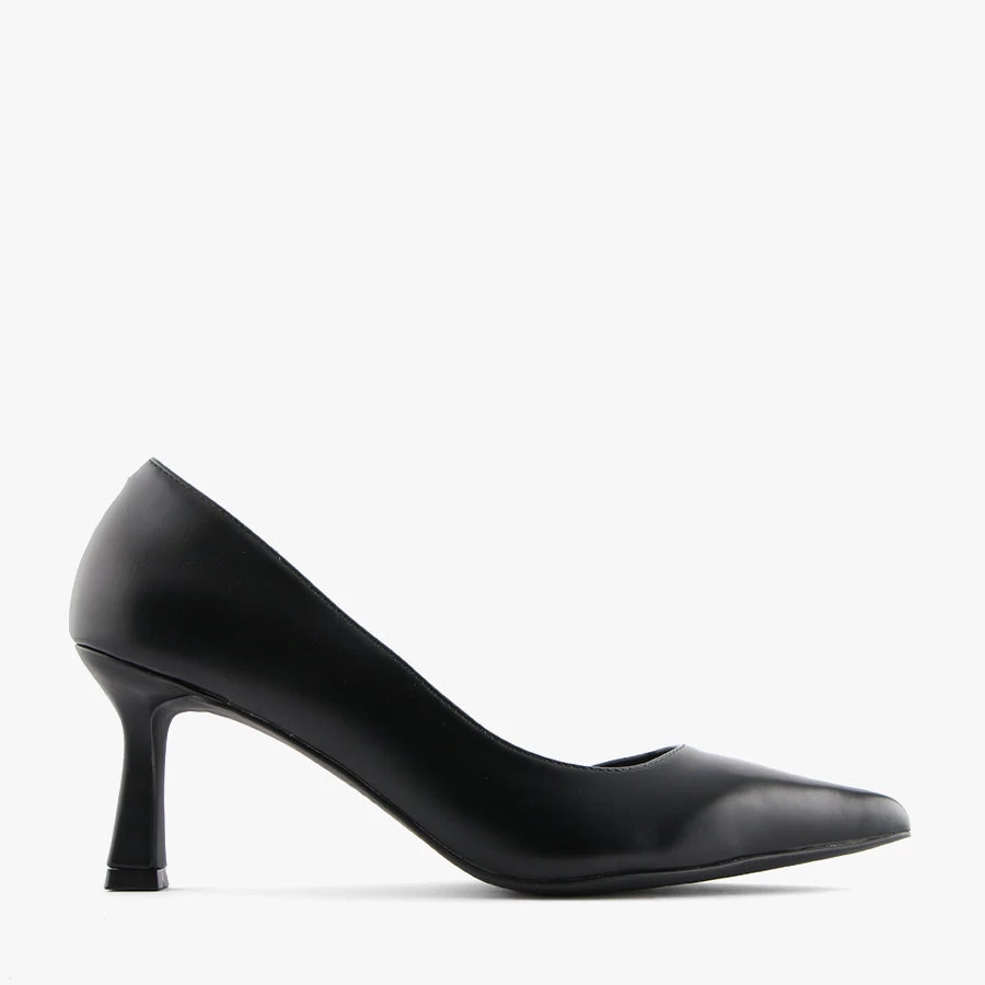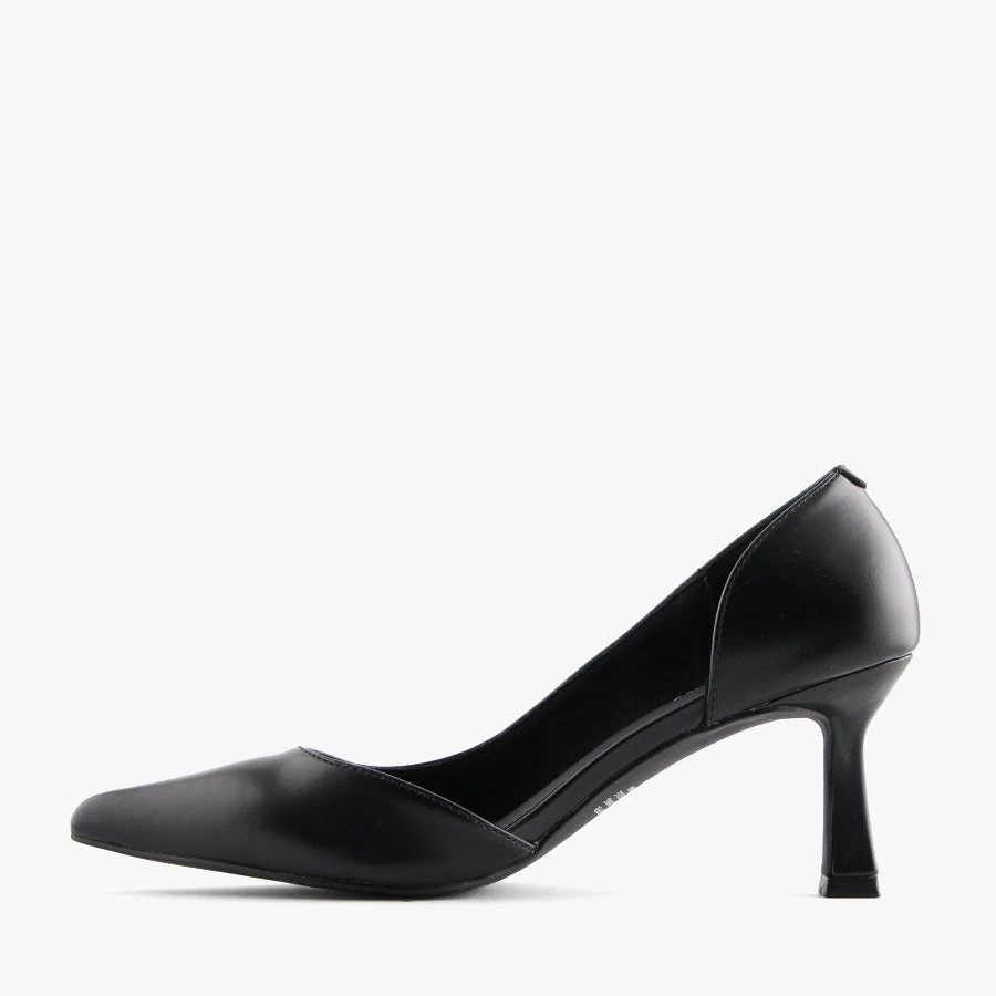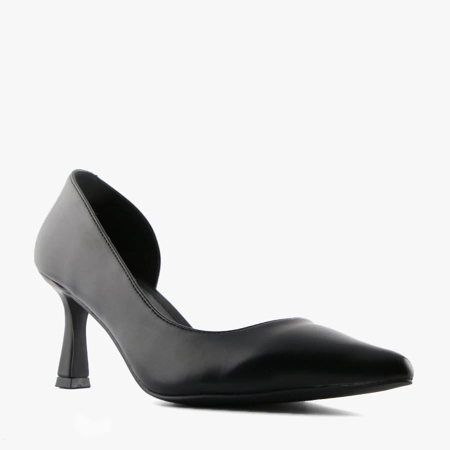 Scandal by Therapy is a pointed toe pump that features a square stiletto heel and cut out panel on the side.