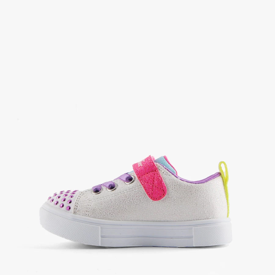 BFF Magic by Skechers is an infants shoe that features a bungee elastic lace, velcro strap closure and light up sparkles on the toe.
