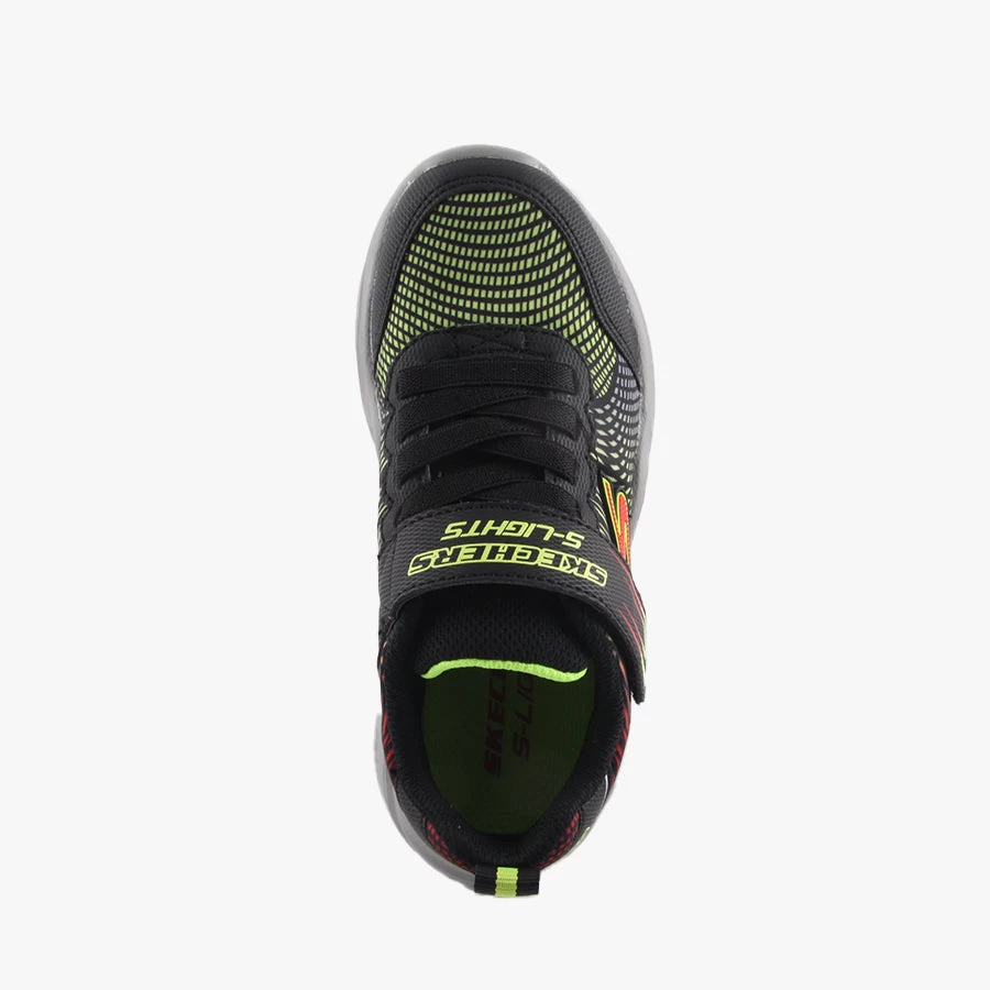 Erupters 1V by Skechers is a kids sneaker that features an elastic bungee lace, velcro strap closure, and vibrant light up sole.