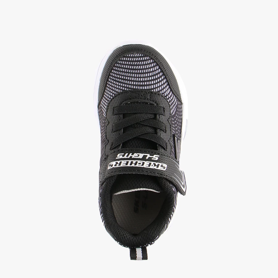 Erupters 1V by Skechers is an infants sneaker that features an elastic bungee lace, velcro strap closure, and vibrant light up sole.