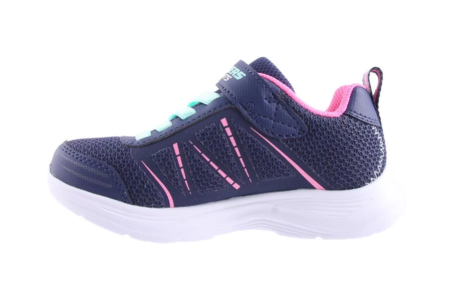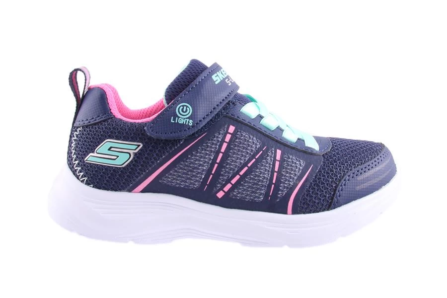 Glimmer kicks Shimmy Brights by Skechers is a kid’s sneaker that features a light-up side panel with on/off switch, elastic bungee laces and velcro strap.