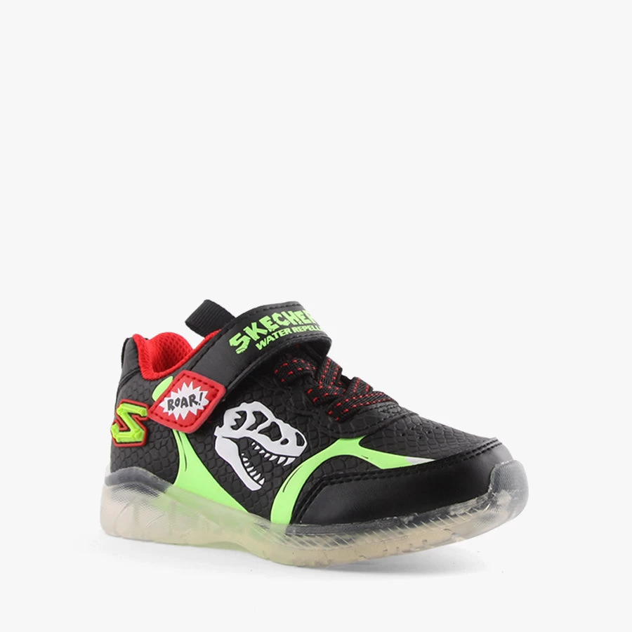 Light-up your steps in Illumi-Brights by Skechers with the Dino-Glo shoe. This light-up slip-on sneaker features a Skech-O-Saurus themed design, cushioned insole and a water repellant synthetic and mesh upper with a stretch-laced front.