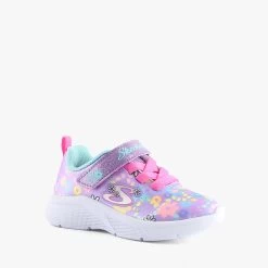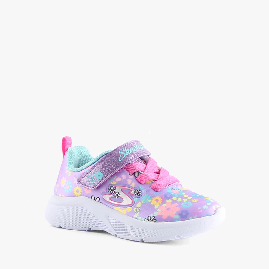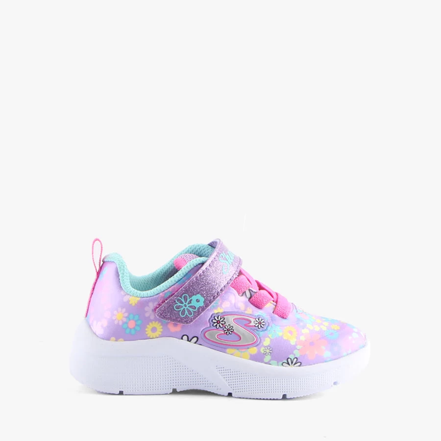 MS-DAISY FUN by Skechers is a kids sneaker that features a lightweight sole, bungee elastic lace and velcro strap closure. A machine washable design.