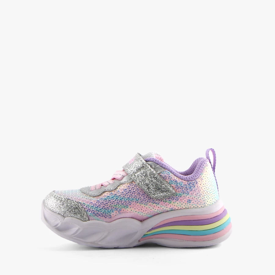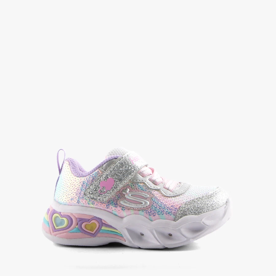 Sweetheart Lets Shine by Skechers is an infants sneaker that features an elastic bungee lace, velcro strap closure and multicoloured heart shaped light up sole.