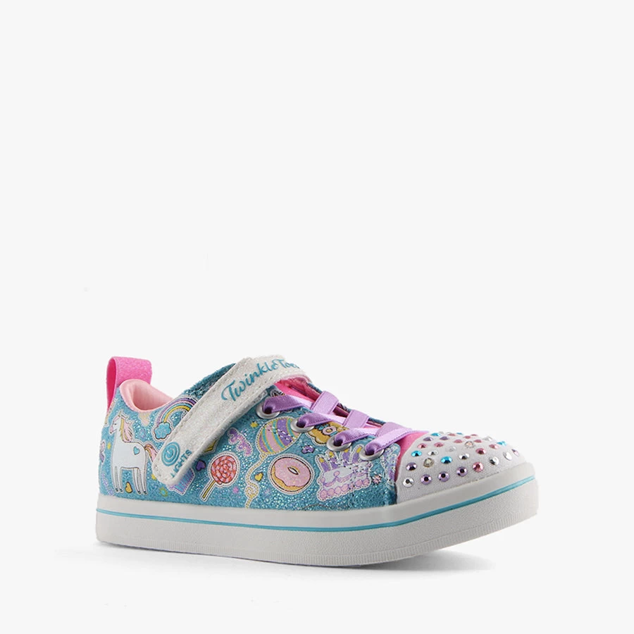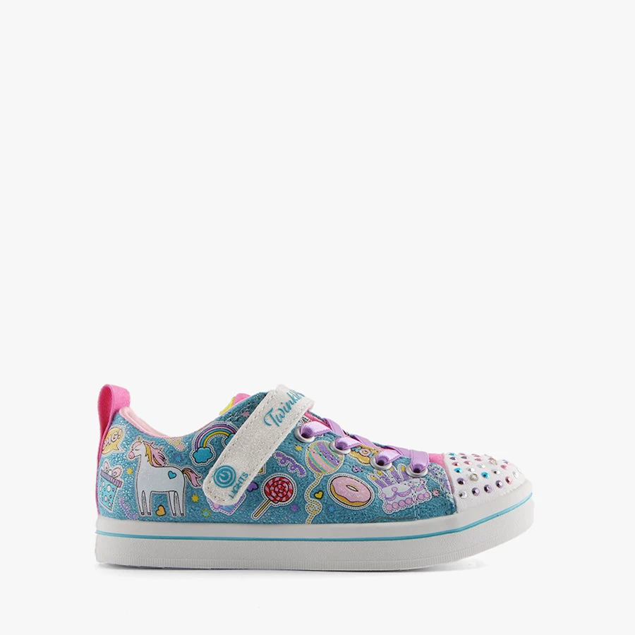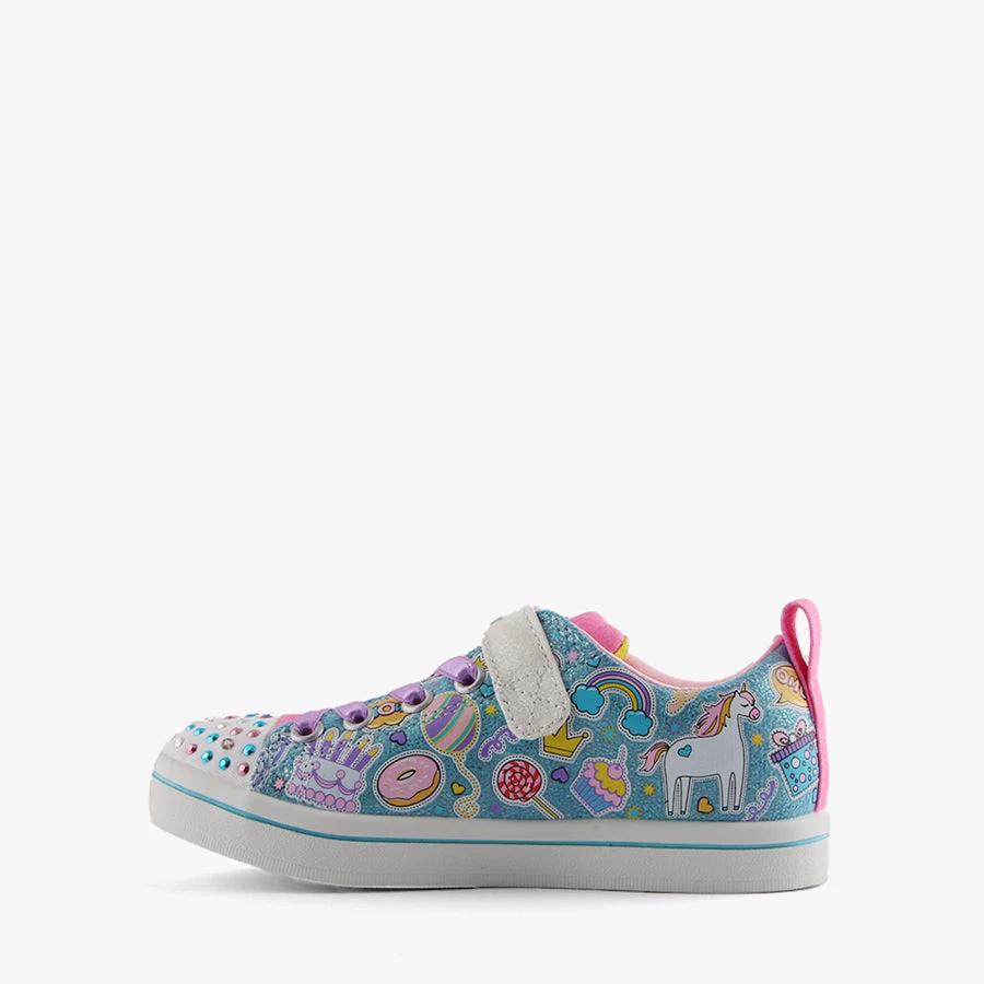SR-Unicorn Party by Skechers is a kids shoe that features a bungee elastic lace, velcro strap closure and light up sparkles on the toe.
