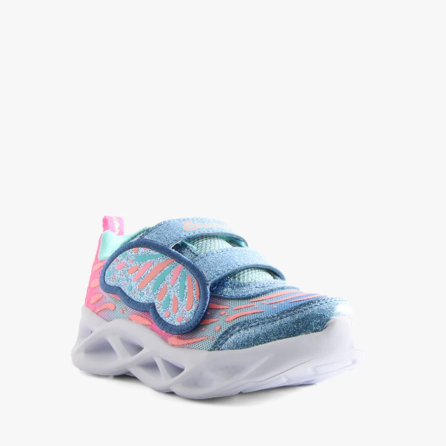 TB Wingin’ It by Skechers is an infant’s sneaker that features a light-up sole and wide velcro strap for easy wear.