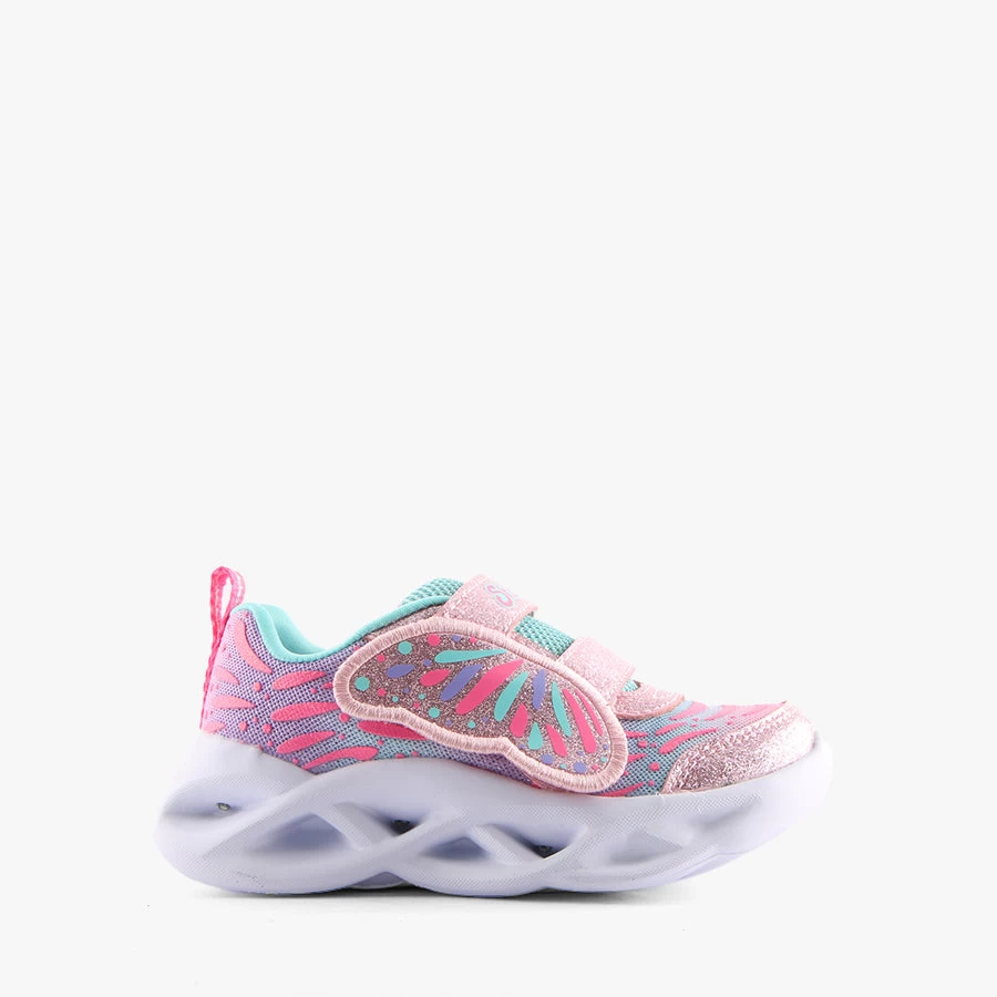 TB Wingin’ It by Skechers is an infants sneaker that features a light-up sole and wide velcro strap for easy wear.