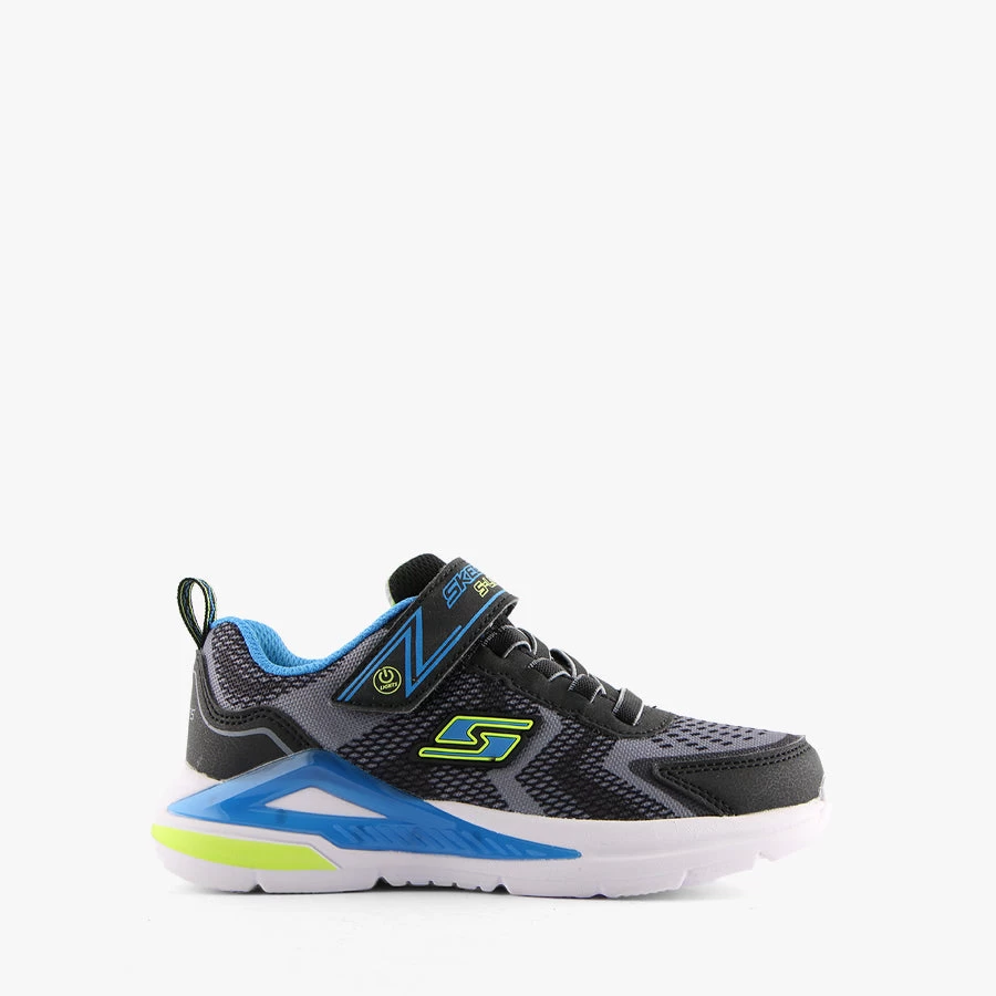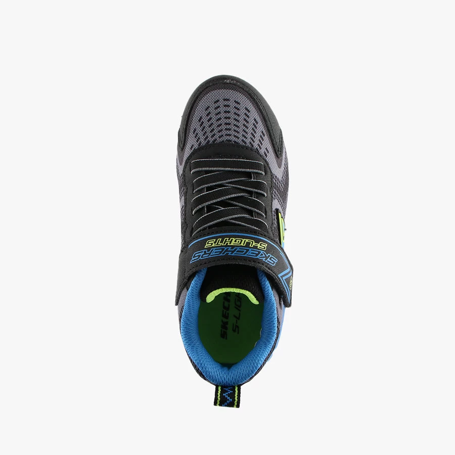 Tri Namics by Skechers is a kids light up sneaker that features an elastic bungee lace, velcro strap closure and light up sole with an on/off switch.