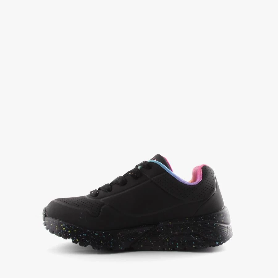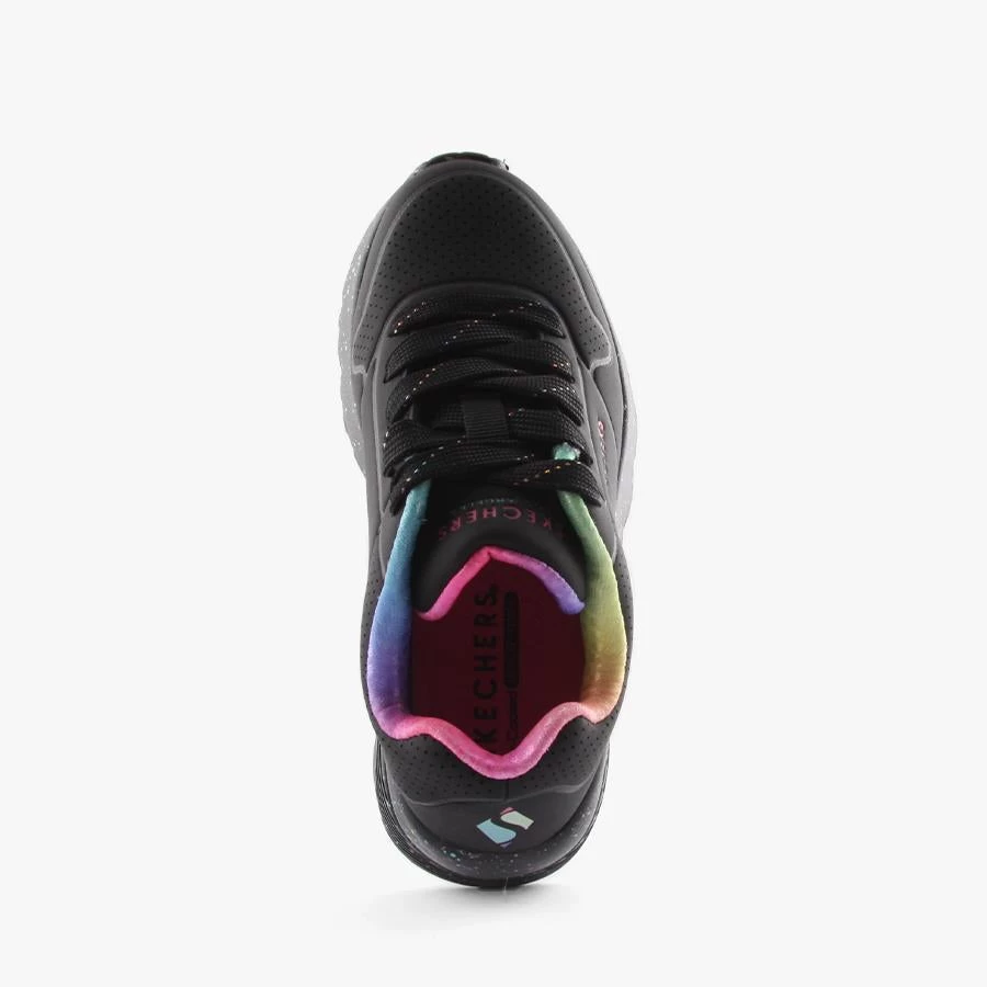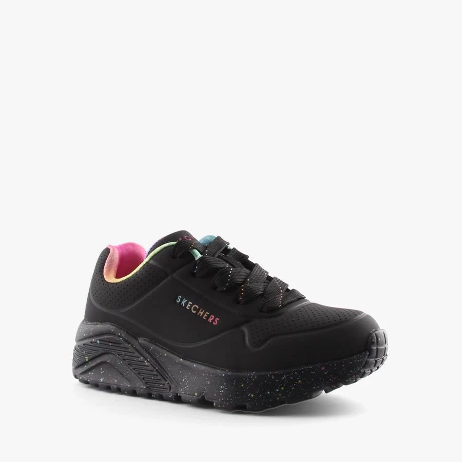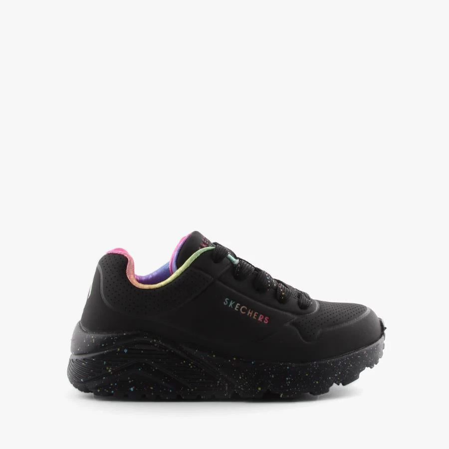 UL Rainbow Speckle by Skechers is a kids lace up sneaker that features a fun rainbow speckled chunky sole, rainbow lining and Skechers signature air cooled memory foam insole.
