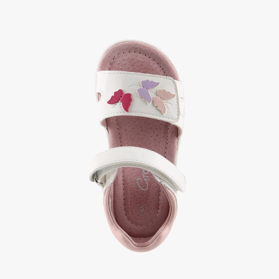 Splice by Grosby is an infants sandal featuring an adjustable velcro strap embellished with a butterfly motif and finished with soft leather lining.