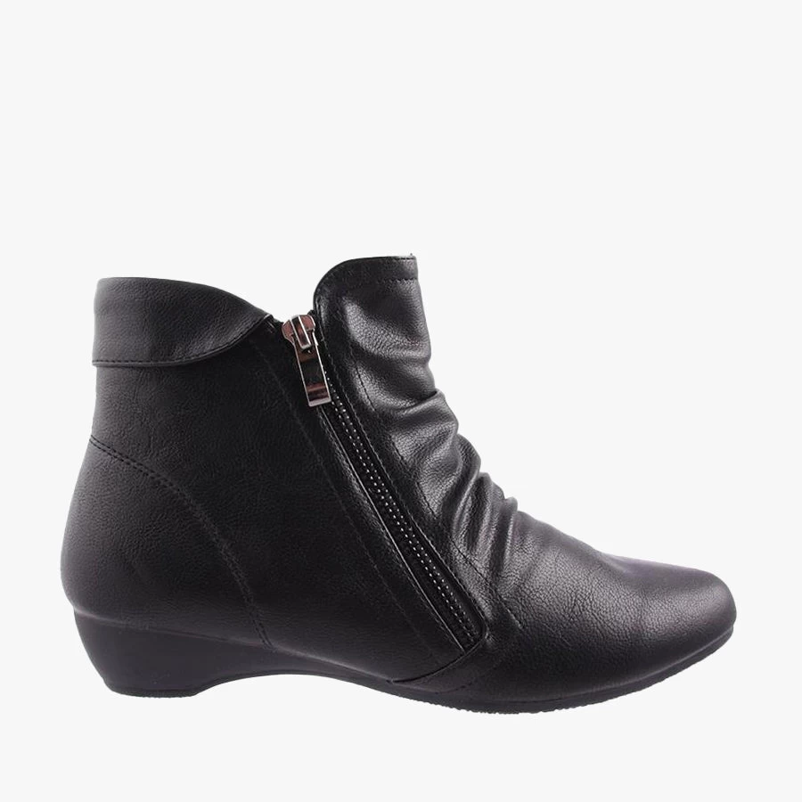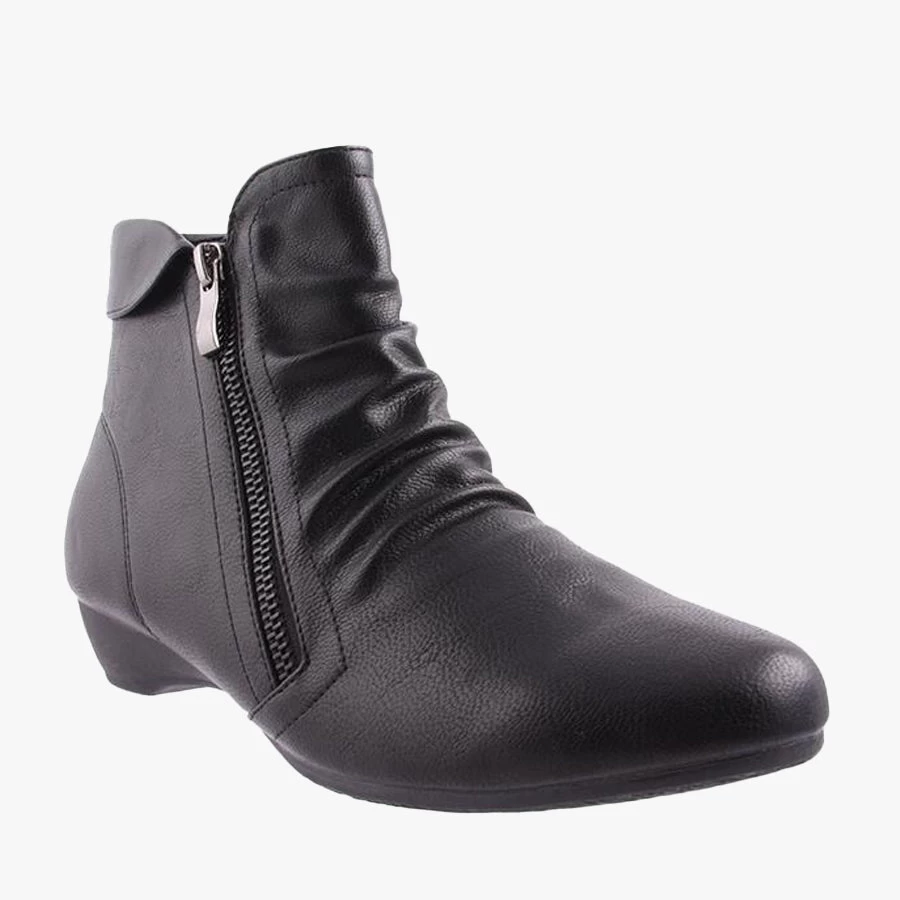 Valat by Bellissimo is a woman’s ankle boot that features a ruched upper, small heel and decorative outer zipper with a functioning inside zipper.
