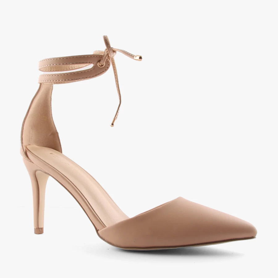 Wilma by Verali is a classic women’s court shoe with a twist. Featuring a closed in pointed toe and stilleto heel, cutout sides and a delicate tie-up ankle strap with gold detailing.