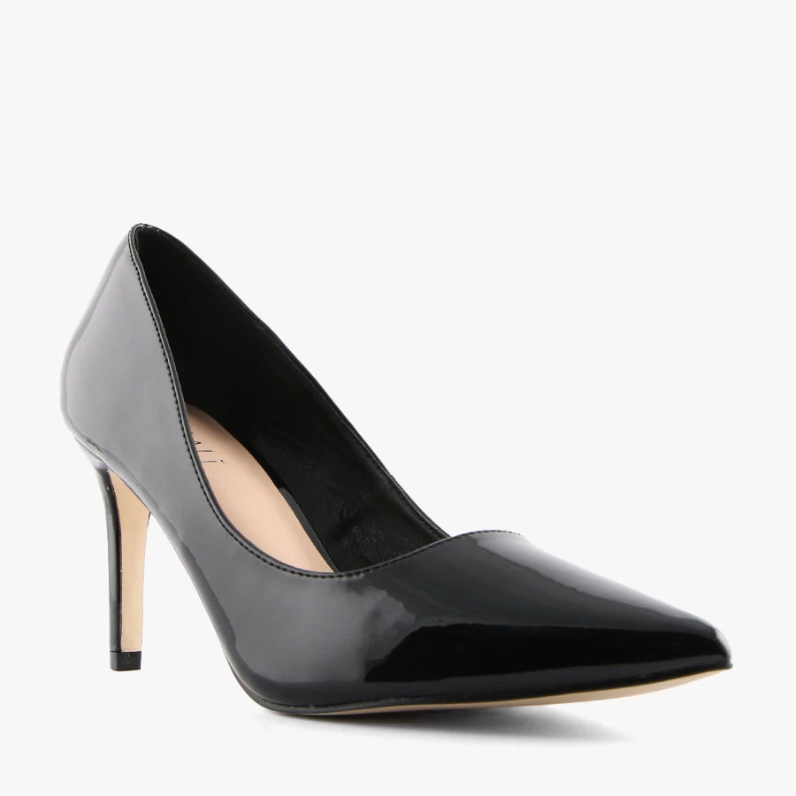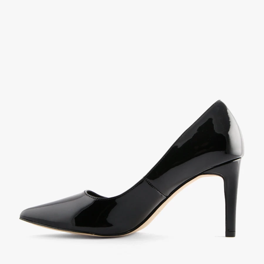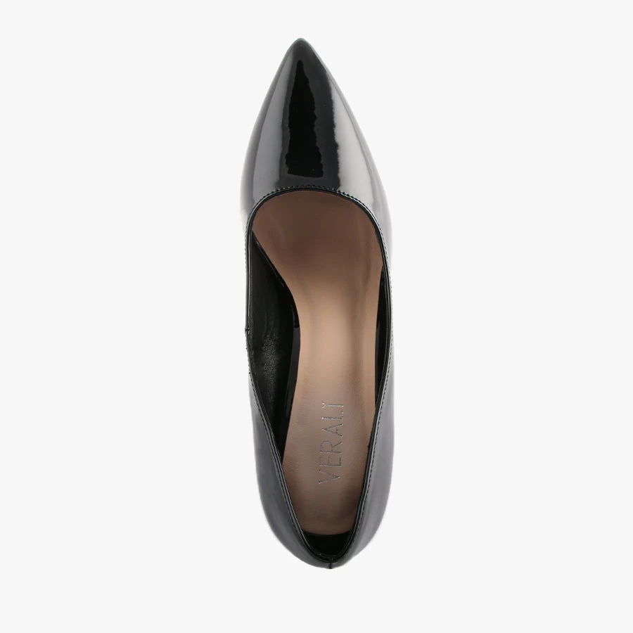 Wish by Verali is a women’s pump that features a smooth patent upper, a pointed toe set on a stiletto heel with a fine stitch detail around the top.